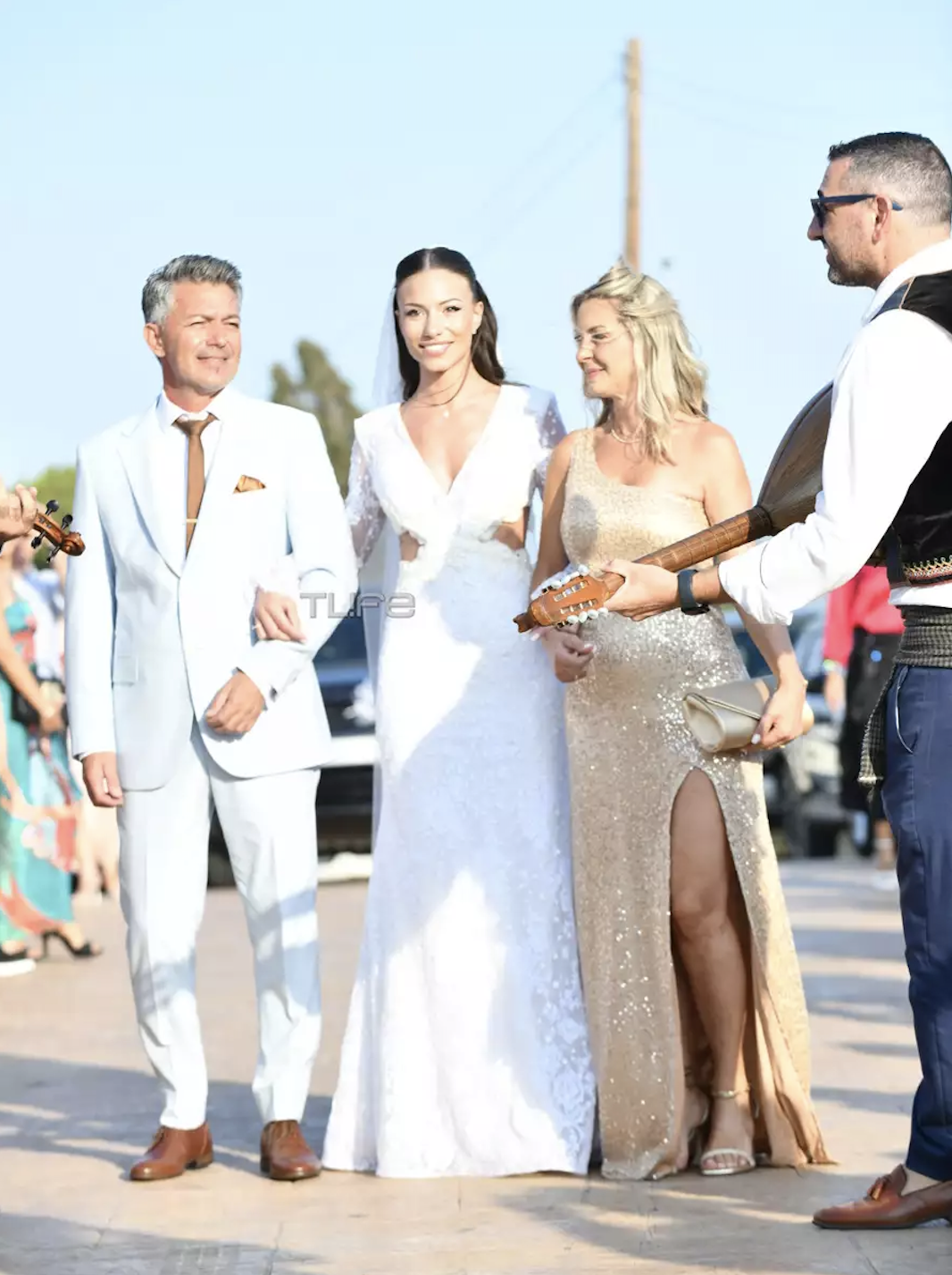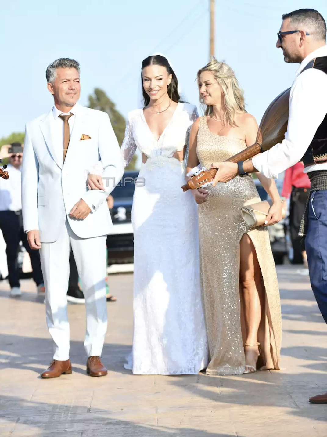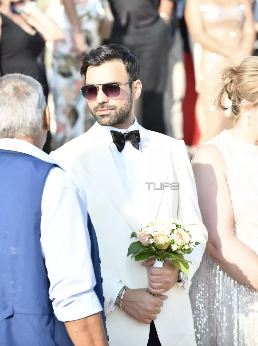 Ο γαμπρός, Αντρέας Γεωργίου, επέλεξε ένα κοστούμι σε ασπρόμαυρο χρώμα, ενώ στο πλευρό του βρέθηκαν οι συνεργάτες του από τη σειρά «Γη της Ελιάς» στο Mega.