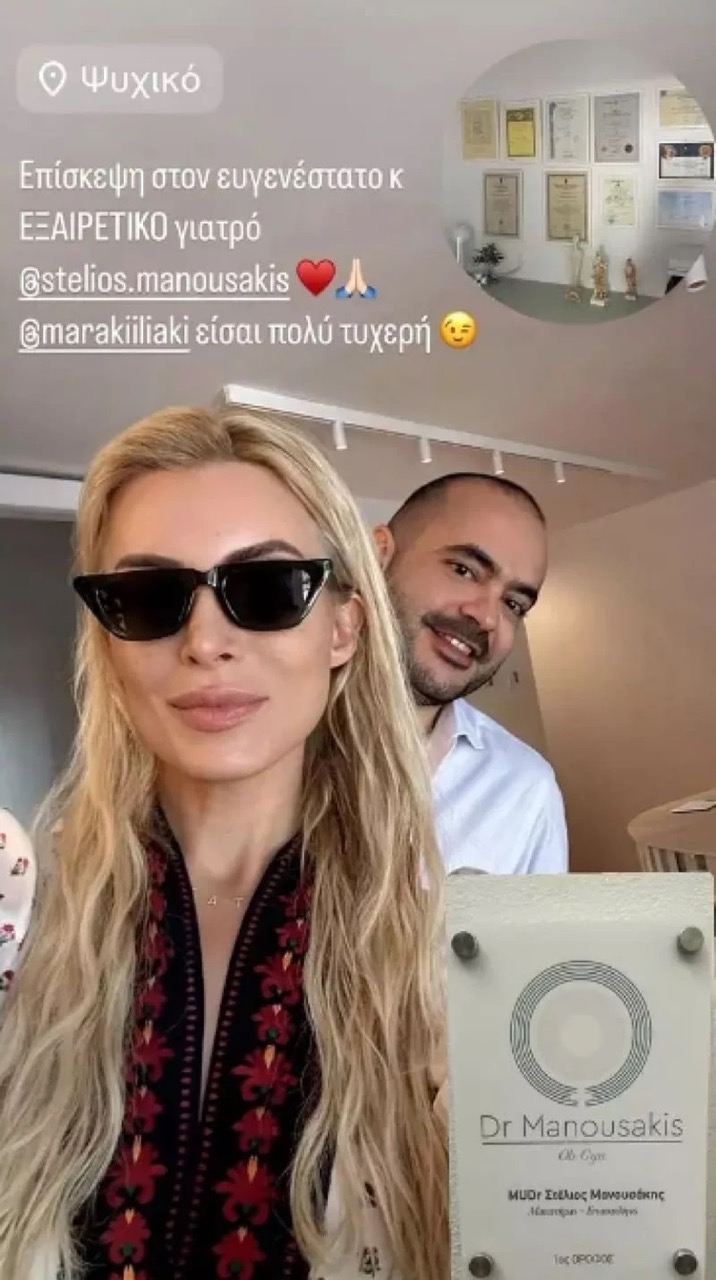 Την Κυριακή 25 Αυγούστου, η Κατερίνα μοιράστηκε με τους ακόλουθούς της στο Instagram μια φωτογραφία από την επίσκεψή της στο ιατρείο του Στέλιου Μανουσάκη, στο Ψυχικό. Στη φωτογραφία, η Κατερίνα ποζάρει χαμογελαστή δίπλα στον γιατρό, γράφοντας στη λεζάντα «Είσαι πολύ τυχερή», κάνοντας tag την φίλη της Μαρία Ηλιάκη.