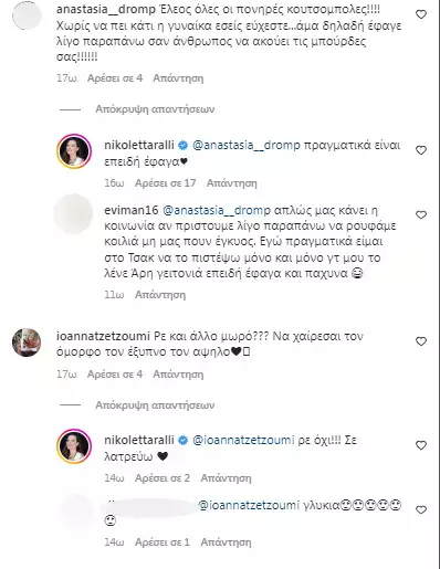 Ωστόσο, η συγκεκριμένη φωτογραφία έμελλε να σχολιαστεί, αφού πολλοί από τους ακόλουθούς της τη ρωτούσαν αν είναι έγκυος, με την παρουσιάστρια να απαντάει αρνητικά, επισημαίνοντας ότι η φουσκωμένη κοιλιά της προέρχεται από το πολύ φαγητό.