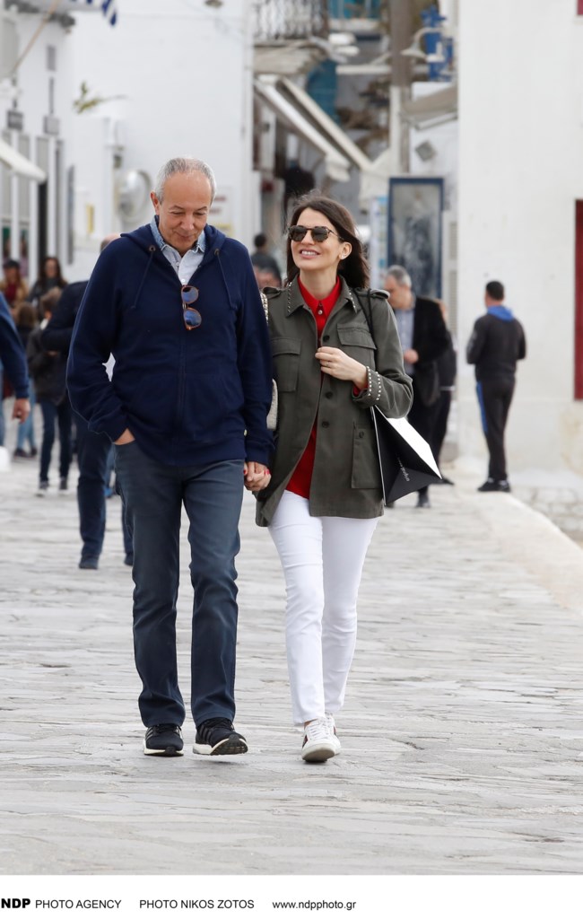 Όπως φαίνεται, ο Γιάννης Κούστας και η σύζυγός του έκαναν βόλτα στο νησί, με τη Δήμητρα Μέρμηγκα να είχε επιλέξει να φορέσει ένα κοντό τζιν σορτς με λευκό τοπ και ασορτί sneakers.