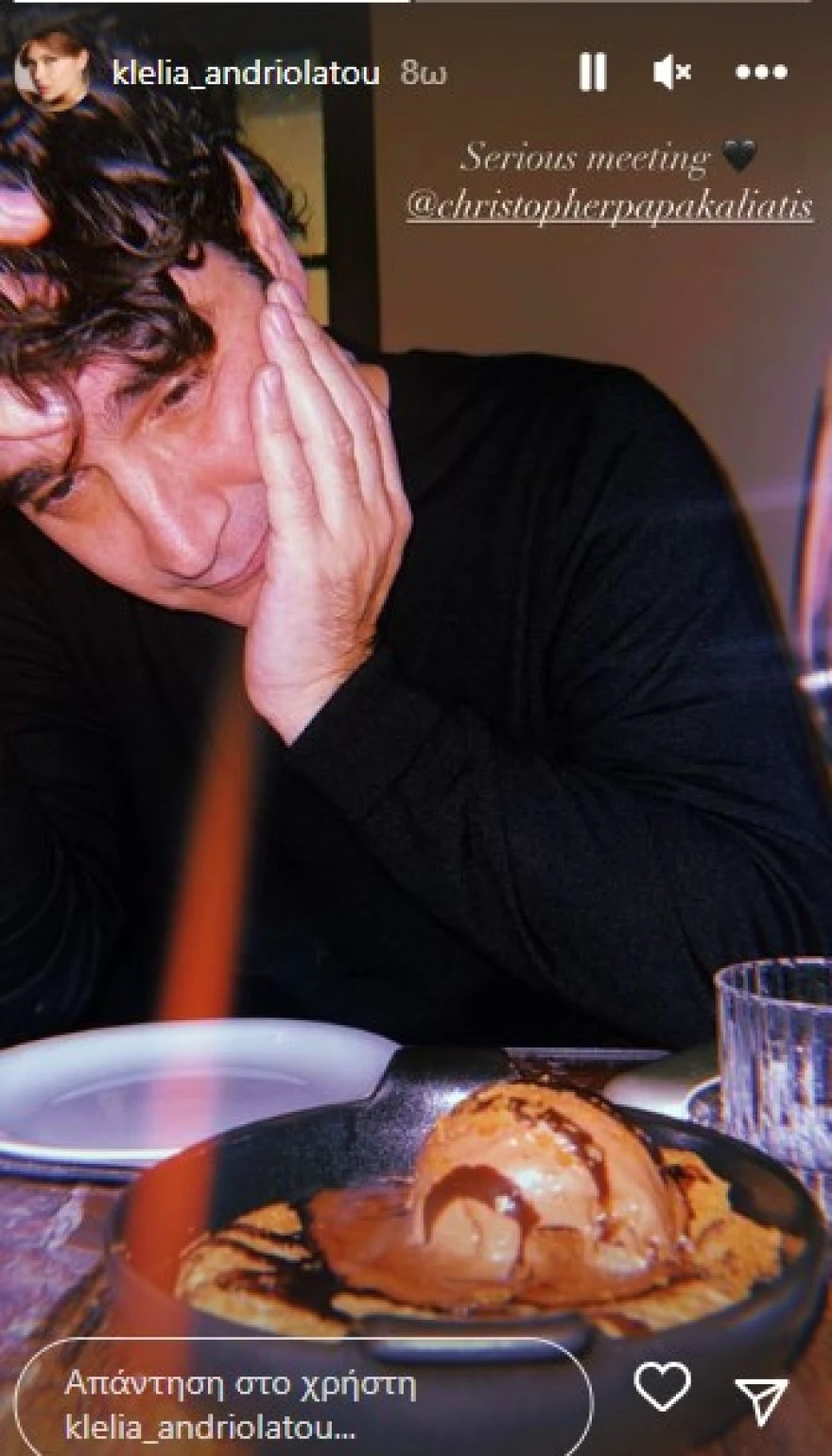 Το βράδυ της Τετάρτης 4 Ιανουαρίου, η ηθοποιός συνάντησε τον Χριστόφορο Παπακαλιάτη. Η 26χρονη φωτογράφησε τον δημιουργό του «Maestro» να στηρίζει το κεφάλι στο χέρι του, ενώ κάθεται απέναντί της. Η συμπρωταγωνίστριά του έγραψε στη λεζάντα της φωτογραφίας «Σοβαρή σύσκεψη», ωστόσο, δεν έδωσε περισσότερες λεπτομέρειες για το αν οι δυο τους συζητούσαν σχετικά με τον 2ο κύκλο της σειράς. Mπροστά του μάλιστα βρίσκεται και ένα μπολ με κρέπα και μια μεγάλη μπάλα παγωτού.