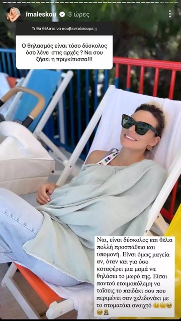 «Θηλάζω αποκλειστικά. Ήταν ζόρικα στην αρχή αλλά είναι αυτό που λένε ότι οι πρώτες 40 μέρες είναι καταλυτικής σημασίας. Γερό crash test από κάθε άποψη. Χαλάλι όμως όλα. Δάκρυα, πόνοι, ξενύχτια. Όλα» αποκάλυψε αρχικά η γνωστή παρουσιάστρια, ενώ στην συνέχεια τόνισε πως: «Ναι, είναι δύσκολος και θέλει προσπάθεια και υπομονή. Είναι όμως μαγεία αν και όταν και για όσο καταφέρει μια μαμά να θηλάσει το μωρό της. Είσαι παντού ετοιμοπόλεμη να ταΐσεις το παιδάκι σου που περιμένει σαν χελιδονάκι με το στοματάκι ανοιχτό.»