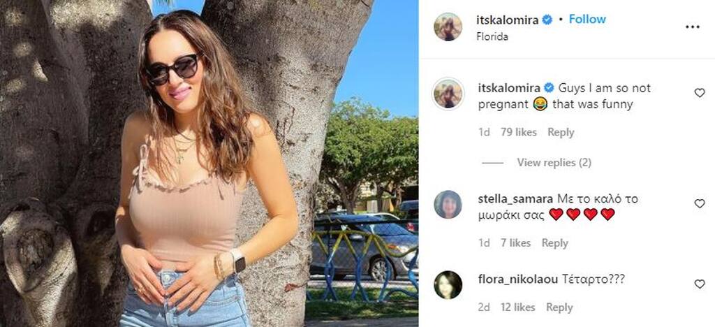 Πιο συγκεκριμένα η Καλομοίρα έγραψε στη λεζάντα της φωτογραφίας της: «Παιδιά δεν είμαι έγκυος 😂 ήταν αστείο».