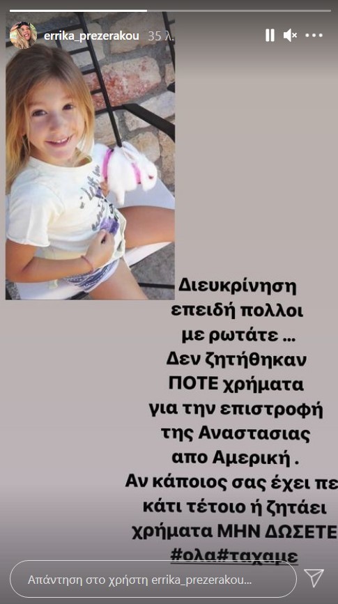 «Διευκρίνιση επειδή πολλοί με ρωτάτε… Δεν ζητήθηκαν ΠΟΤΕ χρήματα για την επιστροφή της Αναστασίας από Αμερική. Αν κάποιος σας έχει πει κάτι τέτοιο ή ζητάει χρήματα ΜΗΝ ΔΩΣΕΤΕ», έγραψε η Έρρικα Πρεζεράκου.