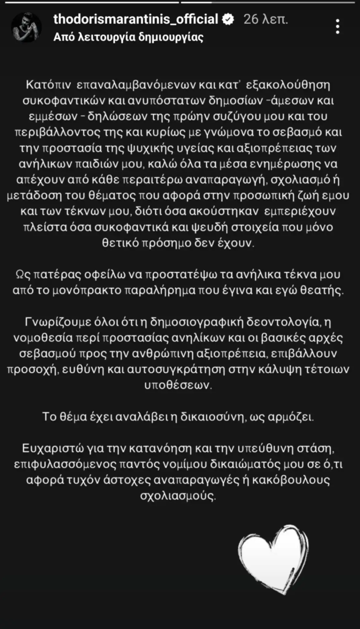 «Κατόπιν επαναλαμβανόμενων και κατ’ εξακολούθηση συκοφαντικών και ανυπόστατων δημοσίων -άμεσων και εμμέσων- δηλώσεων της πρώην συζύγου μου και του περιβάλλοντός της και κυρίως με γνώμονα το σεβασμό και την προστασία της ψυχικής υγείας και αξιοπρέπειας των ανήλικων παιδιών μου, καλώ όλα τα μέσα ενημέρωσης να απέχουν από κάθε περαιτέρω αναπαραγωγή, σχολιασμό ή μετάδοση του θέματος που αφορά στην προσωπική ζωή εμού και των τέκνων μου, διότι όσα ακούστηκαν εμπεριέχουν τουλάχιστον όσα συκοφαντικά και ψευδή στοιχεία που μόνο θετικό πρόσημο δεν έχουν.