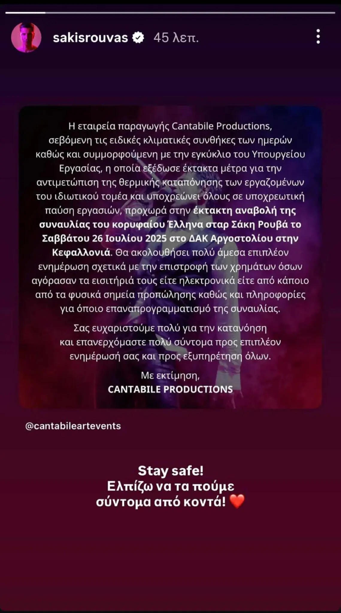 Ο ίδιος ο Σάκης Ρουβάς, δημοσιεύοντας την ανακοίνωση των διοργανωτών, έστειλε το δικό του μήνυμα στους θαυμαστές του, γράφοντας χαρακτηριστικά: «Stay safe! Ελπίζω να τα πούμε σύντομα από κοντά!»