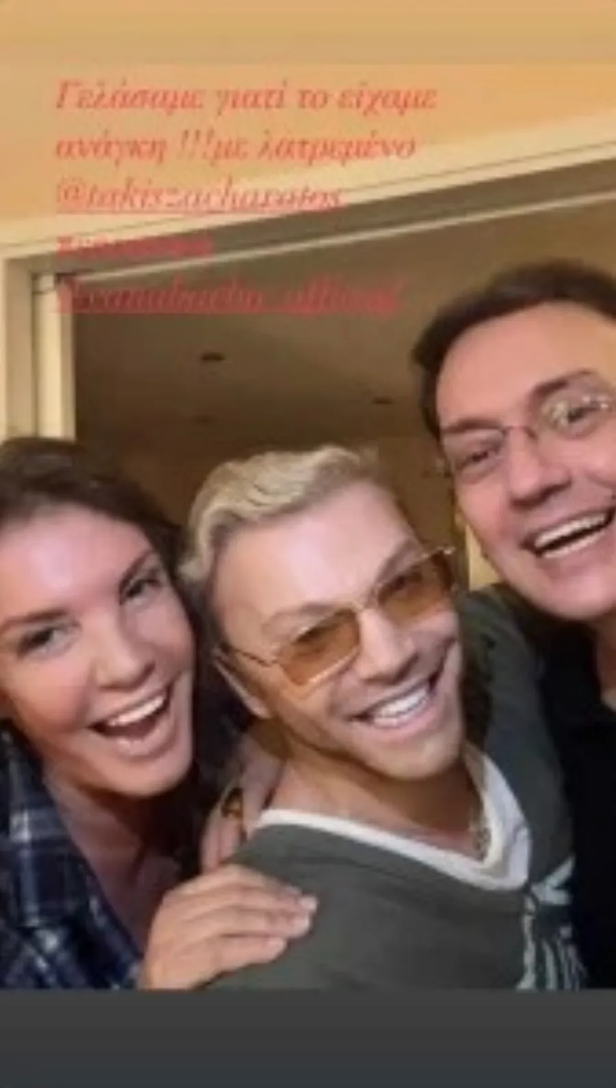 Η ηθοποιός, που ανησύχησε τους φίλους και τους θαυμαστές της, φαίνεται πλέον να αναρρώνει στο σπίτι της, έχοντας δίπλα της ανθρώπους που την αγαπούν και τη στηρίζουν. Στην εικόνα που ανέβηκε στο Instagram, η Βάνα Μπάρμπα ποζάρει χαμογελαστή, έχοντας στο πλευρό της δύο πολύ αγαπημένα της πρόσωπα: τον Τάκη Ζαχαράτο και τον Γιάννη Καζανίδη.