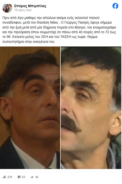 Όπως έγραψε ο βουλευτής και ηθοποιός στην ανάρτηση που έκανε στο Facebook, δημοσιεύοντας δύο φωτογραφίες του Γιώργου Παληού: «Πριν από λίγο μάθαμε την απώλεια ακόμα ενός εκλεκτού παλιού συναδέλφου, μετά τον Θανάση Νάκο.