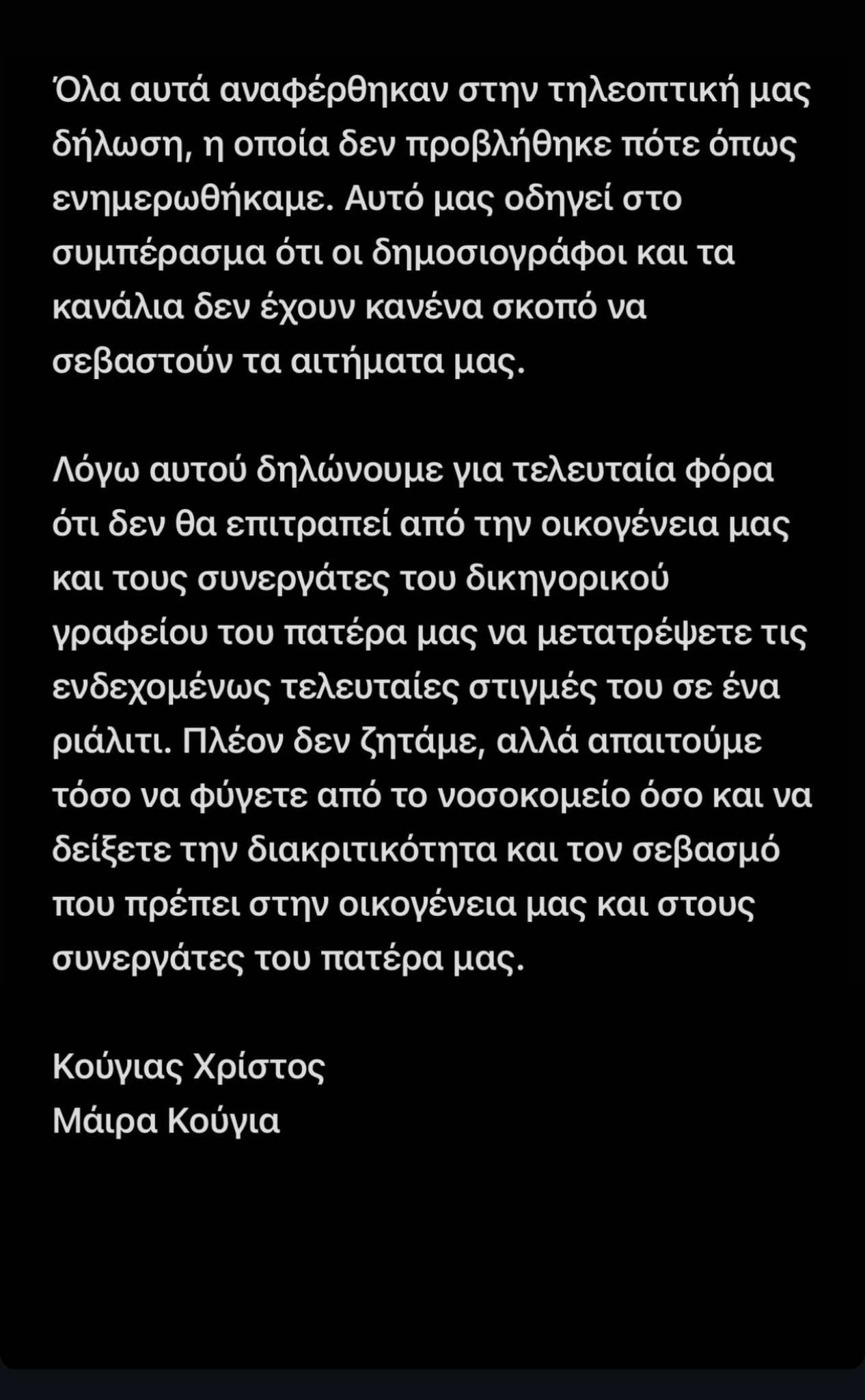 «Σας ζητάμε να σεβαστείτε την ιδιωτικότητά μας και να μην μας πιέζετε να κάνουμε δηλώσεις επί τους θέματος στην τηλεόραση. Περιμένουμε έστω και τώρα σε αυτές τις δύσκολες ώρες να είξετε σεβασμό στην οικογένειά μας και στα κοντινά πρόσωπα του πατέρα μας. Χρίστος Κούγιας και Μάιρα Κούγια».