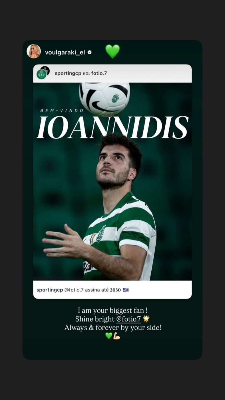 «Είμαι η μεγαλύτερη θαυμάστρια σου. Λάμψε δυνατά Φώτη! Για πάντα στο πλευρό σου» γράφει η Ελένη Βουλγαράκη για την μεταγραφή του Φώτη Ιωαννίδη στην Σπόρτινγκ Λισαβόνας.