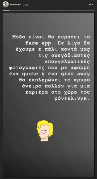Σε φωτογραφία που ανέβασε στο προσωπικό της λογαριασμό στο Instagram, γράφει: «Μόδα είναι θα περάσει το face app. Σε λίγο θα έχουμε και πάλι κοντά μας τις αψεγάδιαστες επαγγελματικές φωτογραφίες, που με αφορμή ένα quote ή ένα give away, θα εκπληρώνει το κρυφό όνειρο πολλών για μία καριέρα στο χώρο του μόντελινγκ» ενώ δεν διευκρίνισε για ποιον… «χτυπάει η καμπάνα».