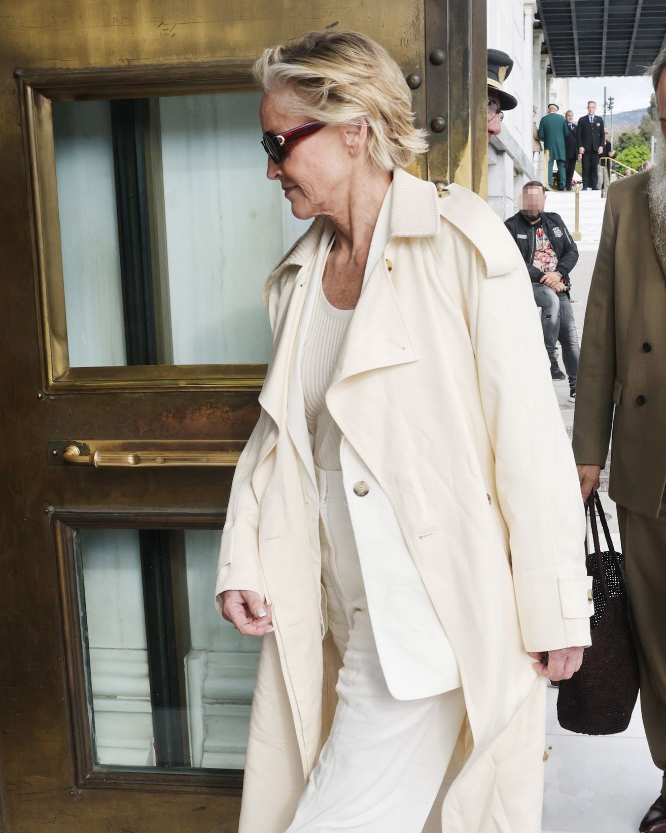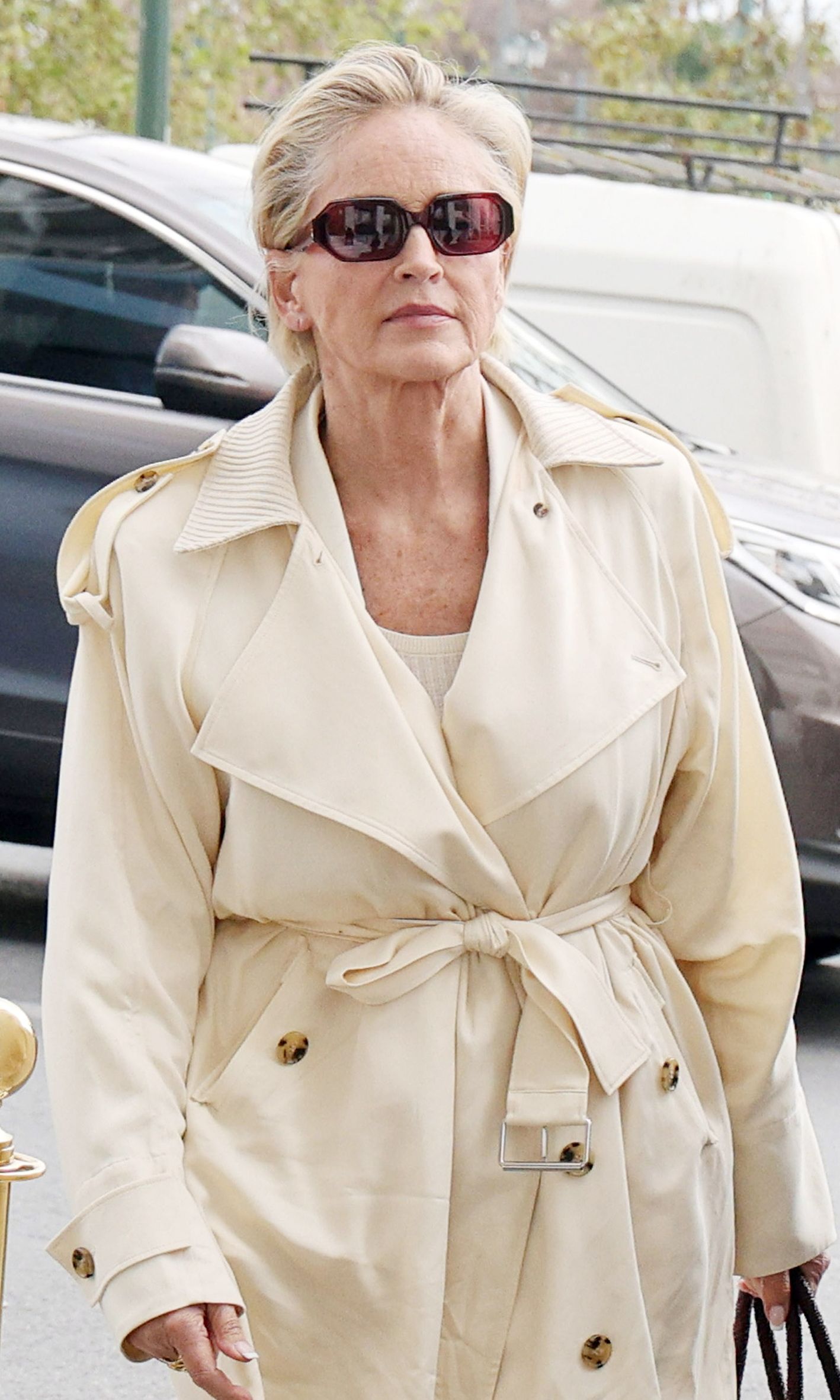 Η Sharon Stone εμφανίστηκε με μία μπεζ δερμάτινη καμπαρντίνα, δίνοντας έμφαση στο εκλεπτυσμένο, αλλά ταυτόχρονα ανεπιτήδευτο στυλ που τη χαρακτηρίζει εδώ και δεκαετίες.