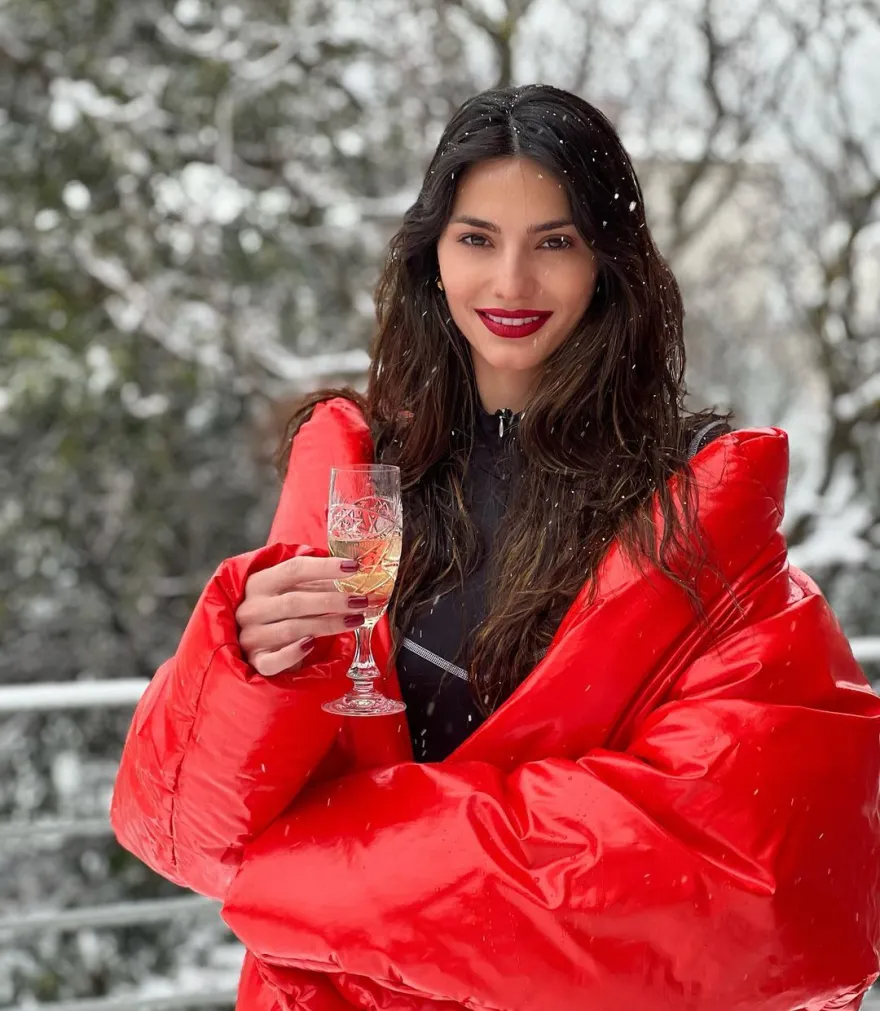 Το μοντέλο και παρουσιάστρια πόζαρε, με ένα χοντρό κόκκινο μπουφάν και γυαλιά ηλίου, ενώ έπινε τη σαμπάνια της και έγραψε στη λεζάντα «Ζήτω τα 35», αποκαλύπτοντας την ηλικία της.