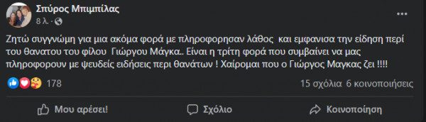 Όλα ξεκίνησαν από μια ανάρτηση του Σπύρου Μπιμπίλα που προκάλεσε σάλο καθώς ανέφερε πως «ο Γιώργος Μάγκας πέθανε», λόγω λανθασμένης πληροφόρησης του, όπως παραδέχθηκε αργότερα, απολογούμενος με νέα ανάρτηση του.