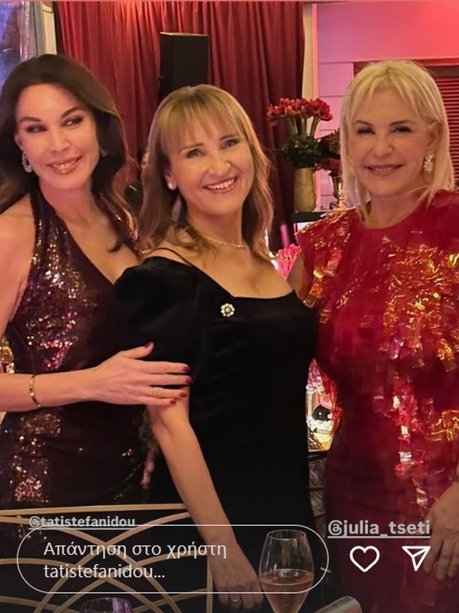 Η πιο πρόσφατη κοσμική συνάντηση της Τατιάνας Στεφανίδου με τη Μάρα Ζαχαρέα ήταν σε glam χριστουγεννιάτικο πάρτι. Η διευθύντρια ειδήσεων του Star, Μάρα Ζαχαρέα και η Τατιάνα ήταν ανάμεσα στους καλεσμένους. Η σύζυγος του Νίκου Ευαγγελάτου έλαμπε μέσα σε ένα sequined αμάνικο φόρεμα σε burgundy απόχρωση. Όσο για τη Μάρα Ζαχαρέα προτίμησε ένα διαχρονικό μαύρο βελούδινο φόρεμα με puffy κοντά μανίκια, και πρόσθεσε μια λαμπερή καρφίτσα.