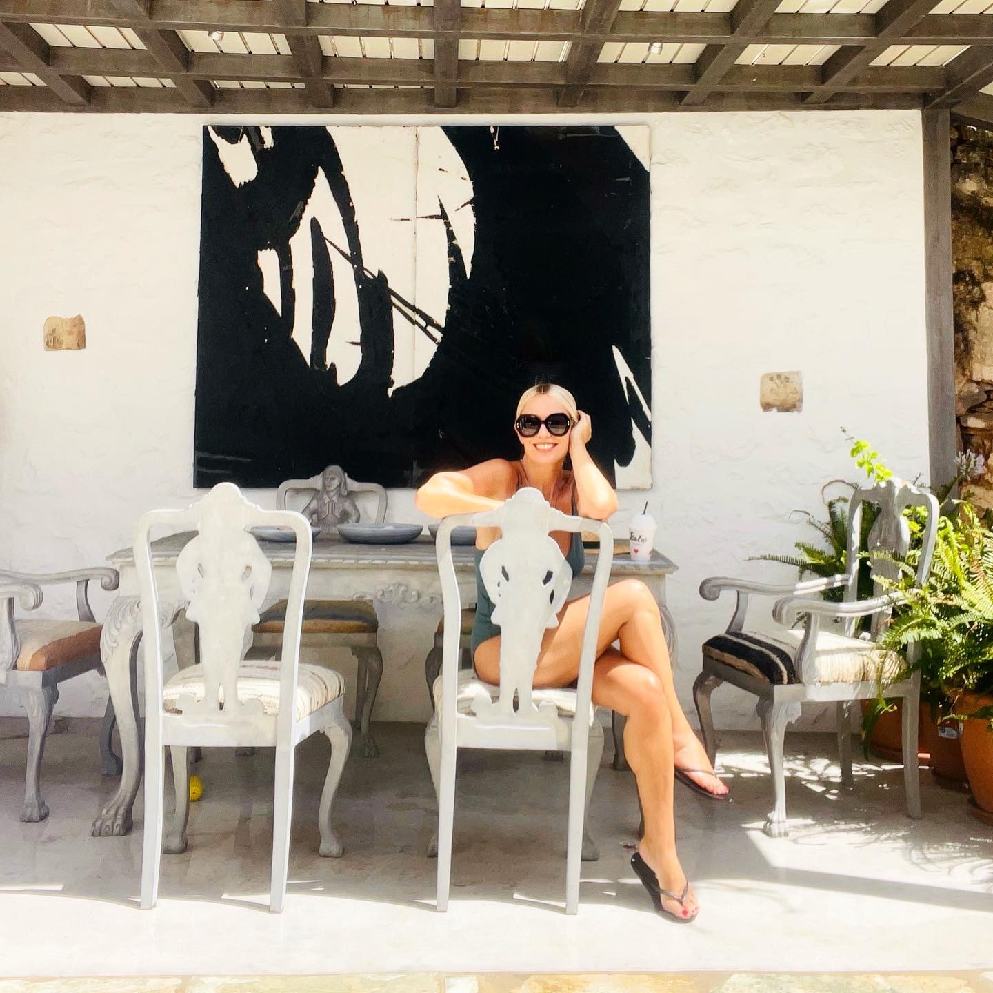 Ειδικότερα, η παρουσιάστρια είναι καθισμένη σε μία καρέκλα και φοράει το αγαπημένο της ολόσωμο μαγιό, ποζάροντας χαμογελαστή, με την αψεγάδιαστη σιλουέτα της να τραβάει τα βλέμματα.