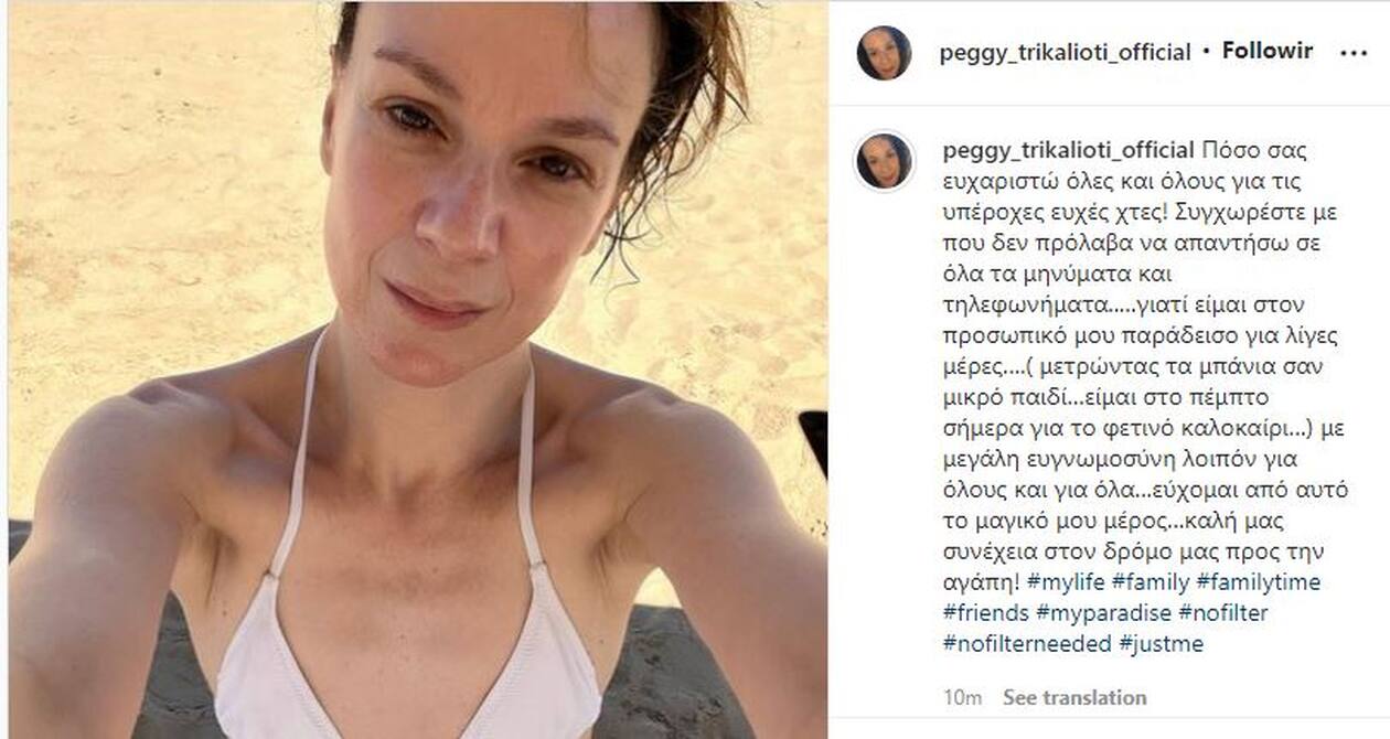 «Πόσο σας ευχαριστώ όλες και όλους για τις υπέροχες ευχές χτες! Συγχωρέστε με που δεν πρόλαβα να απαντήσω σε όλα τα μηνύματα και τηλεφωνήματα..…γιατί είμαι στον προσωπικό μου παράδεισο για λίγες μέρες….( μετρώντας τα μπάνια σαν μικρό παιδί…είμαι στο πέμπτο σήμερα για το φετινό καλοκαίρι…) με μεγάλη ευγνωμοσύνη λοιπόν για όλους και για όλα…εύχομαι από αυτό το μαγικό μου μέρος…καλή μας συνέχεια στον δρόμο μας προς την αγάπη! #mylife #family #familytime #friends #myparadise #nofilter #nofilterneeded #justme».
