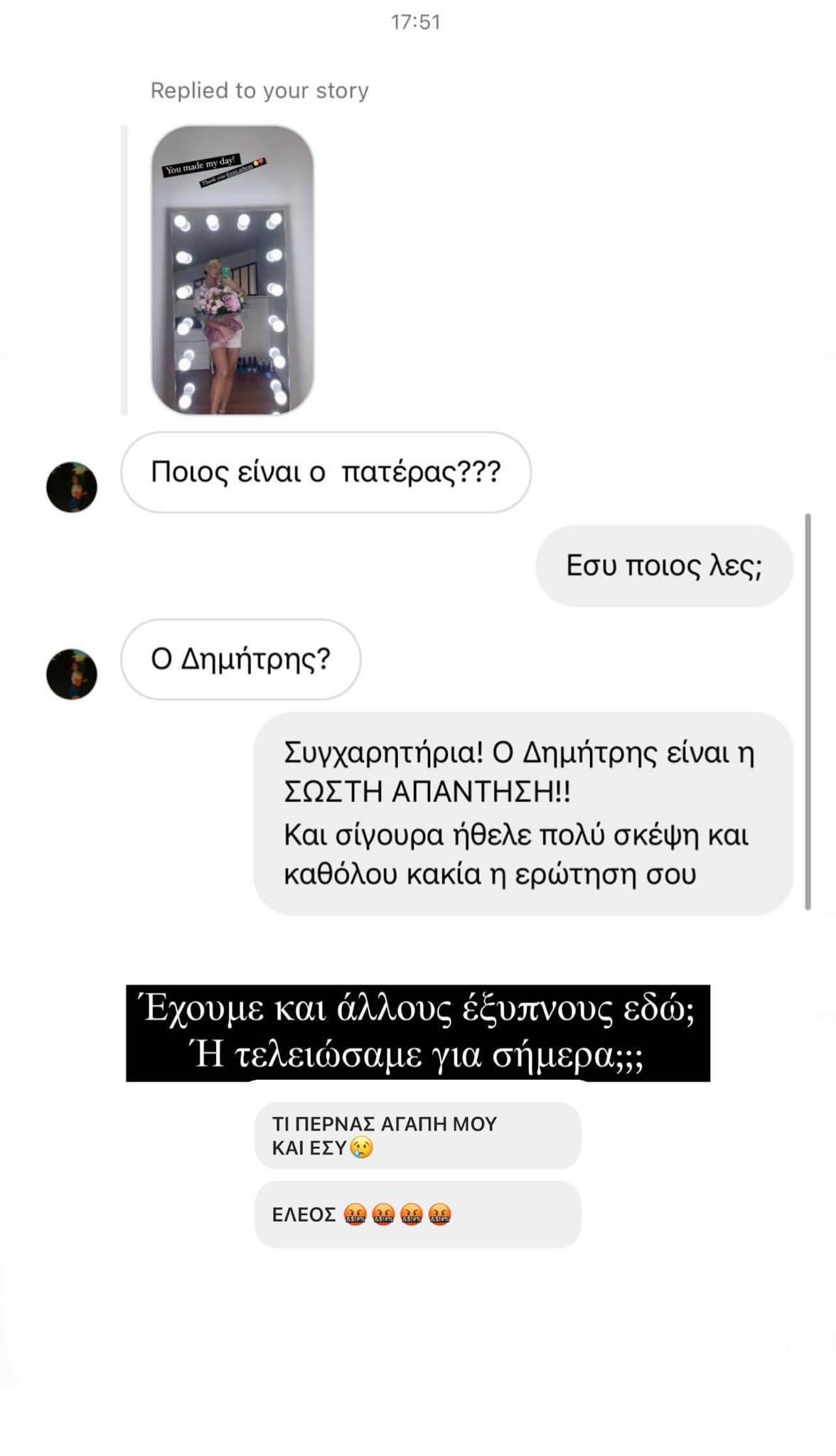 «Ποιος είναι ο πατέρας;» έγραφε το μήνυμα που δέχθηκε η Ιωάννα Τούνη και εκείνη προτίμησε να απαντήσει λιτά: «εσύ ποιος λες;». Ο διαδικτυακός της φίλος συνέχισε. «Ο Δημήτρης;» την ρώτησε. «Συγχαρητήρια. Ο ΔΗΜΗΤΡΗΣ είναι η σωστή απάντηση!!! Και σίγουρα ήθελε πολύ σκέψη και καθόλου κακία η ερώτηση σου» απάντησε η inflluencer.