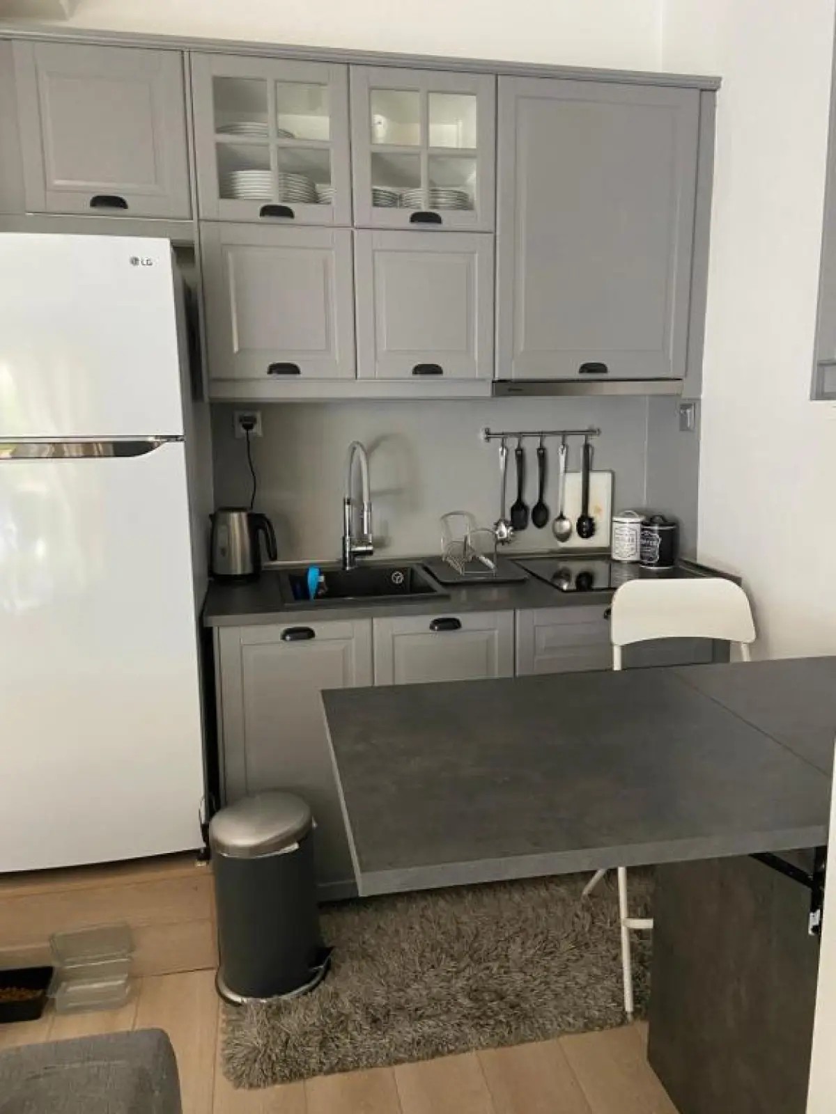 - Κουζινάκι με ψυγείο, φούρνο μικροκυμάτων, τοστιέρα, ηλεκτρικό βραστήρα και τραπέζι φαγητού