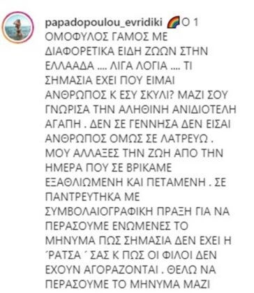 “Ο 1 ΟΜΟΦΥΛΟΣ ΓΑΜΟΣ ΜΕ ΔΙΑΦΟΡΕΤΙΚΑ ΕΙΔΗ ΖΩΩΝ ΣΤΗΝ ΕΛΛΑΑΔΑ …. ΛΙΓΑ ΛΟΓΙΑ …. ΤΙ ΣΗΜΑΣΙΑ ΕΧΕΙ ΠΟΥ ΕΙΜΑΙ ΑΝΘΡΩΠΟΣ Κ ΕΣΥ ΣΚΥΛΙ? ΜΑΖΙ ΣΟΥ ΓΝΩΡΙΣΑ ΤΗΝ ΑΛΗΘΙΝΗ ΑΝΙΔΙΟΤΕΛΗ ΑΓΑΠΗ . ΔΕΝ ΣΕ ΓΕΝΝΗΣΑ ΔΕΝ ΕΙΣΑΙ ΑΝΘΡΩΠΟΣ ΟΜΩΣ ΣΕ ΛΑΤΡΕΥΩ . ΜΟΥ ΑΛΛΑΞΕΣ ΤΗΝ ΖΩΗ ΑΠΟ ΤΗΝ ΗΜΕΡΑ ΠΟΥ ΣΕ ΒΡΗΚΑΜΕ ΕΞΑΘΛΙΩΜΕΝΗ ΚΑΙ ΠΕΤΑΜΕΝΗ . ΣΕ ΠΑΝΤΡΕΥΤΗΚΑ ΜΕ ΣΥΜΒΟΛΑΙΟΓΡΑΦΙΚΗ ΠΡΑΞΗ ΓΙΑ ΝΑ ΠΕΡΑΣΟΥΜΕ ΕΝΩΜΕΝΕΣ ΤΟ ΜΗΝΥΜΑ ΠΩΣ ΣΗΜΑΣΙΑ ΔΕΝ ΕΧΕΙ Η ´ΡΑΤΣΑ ´ ΣΑΣ Κ ΠΩΣ ΟΙ ΦΙΛΟΙ ΔΕΝ ΕΧΟΥΝ ΑΓΟΡΑΖΟΝΤΑΙ . ΘΕΛΩ ΝΑ ΠΕΡΑΣΟΥΜΕ ΤΟ ΜΗΝΥΜΑ ΜΑΖΙ ΟΛΟΙ ΕΣΕΙΣ ΕΚΕΙ ΕΞΩ ΝΑ ΥΙΟΘΕΤΗΣΕΤΕ ΕΝΑ ΑΔΕΣΠΟΤΟ . ΠΕΙΝΟΥΝ ΑΙΣΘΑΝΟΝΤΑΙ Κ ΔΙΨΟΥΝ ΑΚΡΙΒΩΣ ΟΠΩΣ ΕΜΕΙΣ !!! ΤΑ ΚΛΟΥΒΙΑ ΕΙΝΑΙ ΓΕΜΑΤΑ . 2 ΕΚΑΤΟΜΜΥΡΙΑ ΚΑΤΑΓΕΓΡΑΜΜΕΝΑ ΑΔΕΣΠΟΤΑ ΖΩΑ ΣΤΗΝ ΕΛΛΑΔΑ Κ ΠΟΣΑ ΜΗ … ΣΑΣ ΠΑΡΑΚΑΛΩ ΕΛΑΤΕ ΝΑ ΕΝΩΣΟΥΜΕ ΤΙΣ ΦΩΝΕΣ ΜΑΣ ΝΑ ΠΟΥΜΕ ΟΧΙ ΣΤΑ ΠΑΡΑΝΟΜΑ ΕΚΤΡΟΦΕΙΑ ΝΑΙ ΣΤΗΝ ΣΤΕΙΡΩΣΗ Κ ΤΗΝ ΥΙΟΘΕΣΙΑ . ΓΙΑΤΙ ΥΠΑΡΧΟΥΝ Κ ΟΙ ΗΘΙΚΕΣ ΑΞΙΕΣ ΣΤΗΝ ΚΟΙΝΩΝΙΑ ΜΗΝ ΤΙΣ ΞΕΧΝΑΜΕ. ΣΤΑΛΙΤΣΑ ΣΕ ΑΓΑΠΑΩ Κ ΕΥΧΟΜΑΙ ΚΑΘΕ ΖΩΑΚΙ ΣΤΗΝ ΘΕΣΗ ΣΟΥ ΝΑ ΕΧΕΙ ΜΙΑ ΥΠΕΡΟΧΗ ΖΩΗ ΣΑΝ ΤΗΝ ΔΙΚΗ ΣΟΥ ΝΑ ΑΓΑΠΗΘΕΙ ΟΠΩΣ ΕΣΥ ΣΤΟ ΤΑΞΙΔΙ ΤΟΥ ΣΕ ΑΥΤΗΝ ΤΗΝ ΓΗ.”.