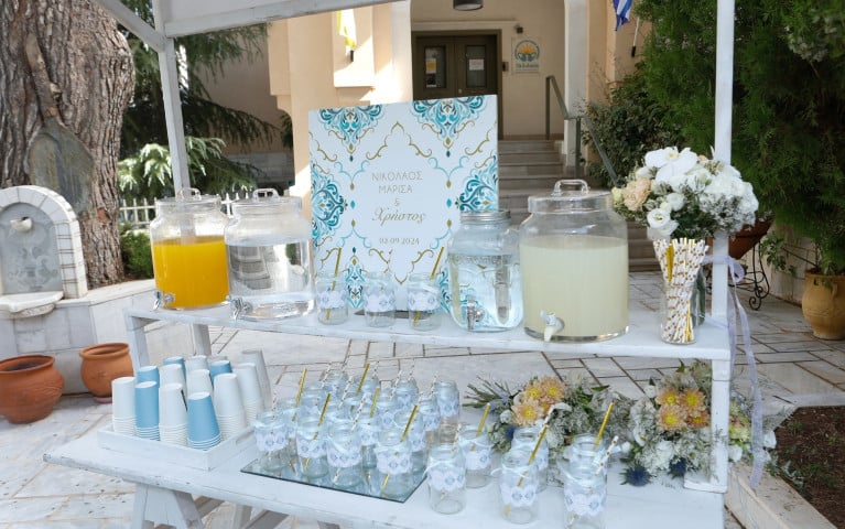 Στον προαύλιο χώρο της εκκλησίας, οι καλεσμένοι υποδέχτηκαν δύο καλάθια με λουλούδια και ένα σταντ με χυμούς, καθώς η ώρα ήταν ζεστή και η δροσιά απαραίτητη. Τα βαφτιστικά του μικρού Χρήστου, μαζί με τα μαρτυρικά και όλα τα απαραίτητα για τη βάπτιση, επιλέχθηκαν με αγάπη από τη μαμά και τη γιαγιά από το ατελιέ Bridal Loft Athens της σχεδιάστριας Φαίδρας Θεοδωρίδου.