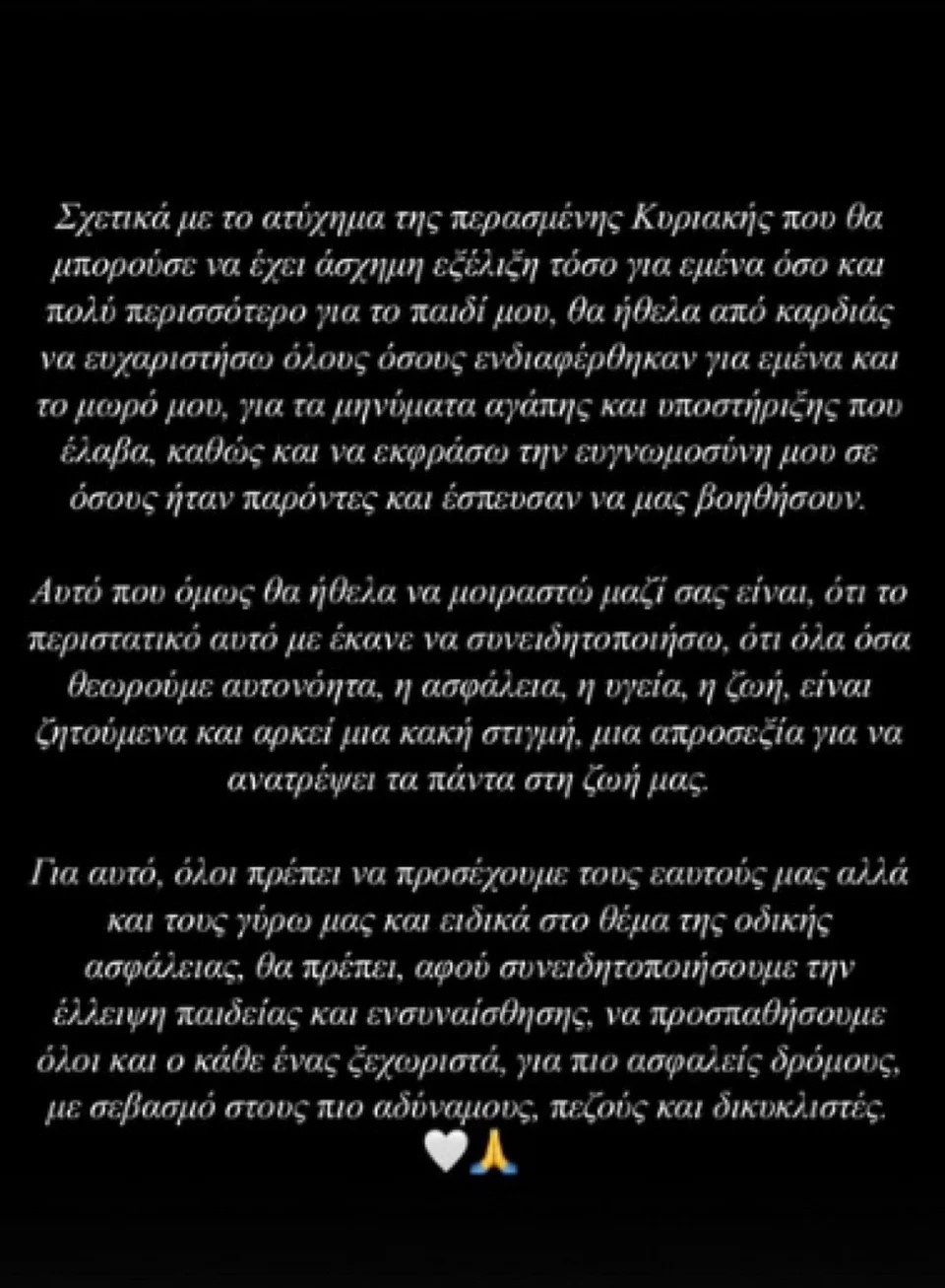 «Σχετικά με το ατύχημα της περασμένης Κυριακής που θα μπορούσε να έχει άσχημη εξέλιξη τόσο για εμένα όσο και πολύ περισσότερο για το παιδί μου, θα ήθελα από καρδιάς να ευχαριστήσω όλους όσους ενδιαφέρθηκαν για εμένα και το μωρό μου, για τα μηνύματα αγάπης και υποστήριξης που έλαβα, καθώς και να εκφράσω την ευγνωμοσύνη μου σε όσους ήταν παρόντες και έσπευσαν να μας βοηθήσουν».