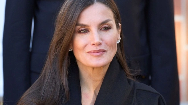 Για την επίσκεψή της, η βασίλισσα Λετίσια επέλεξε ένα μαύρο μίντι φόρεμα από τον οίκο Boss, το οποίο είχε μια υπέροχη λεπτομέρεια στους ώμους.