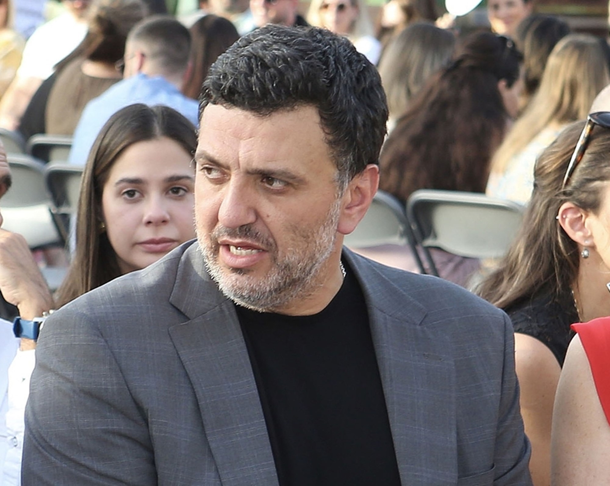 Ο Υπουργός Κλιματικής Κρίσης και Πολιτικής Προστασίας εμφανίστηκε στην εκδήλωση φορώντας γκρι κοστούμι, μαύρο T-shirt και αθλητικά παπούτσια.