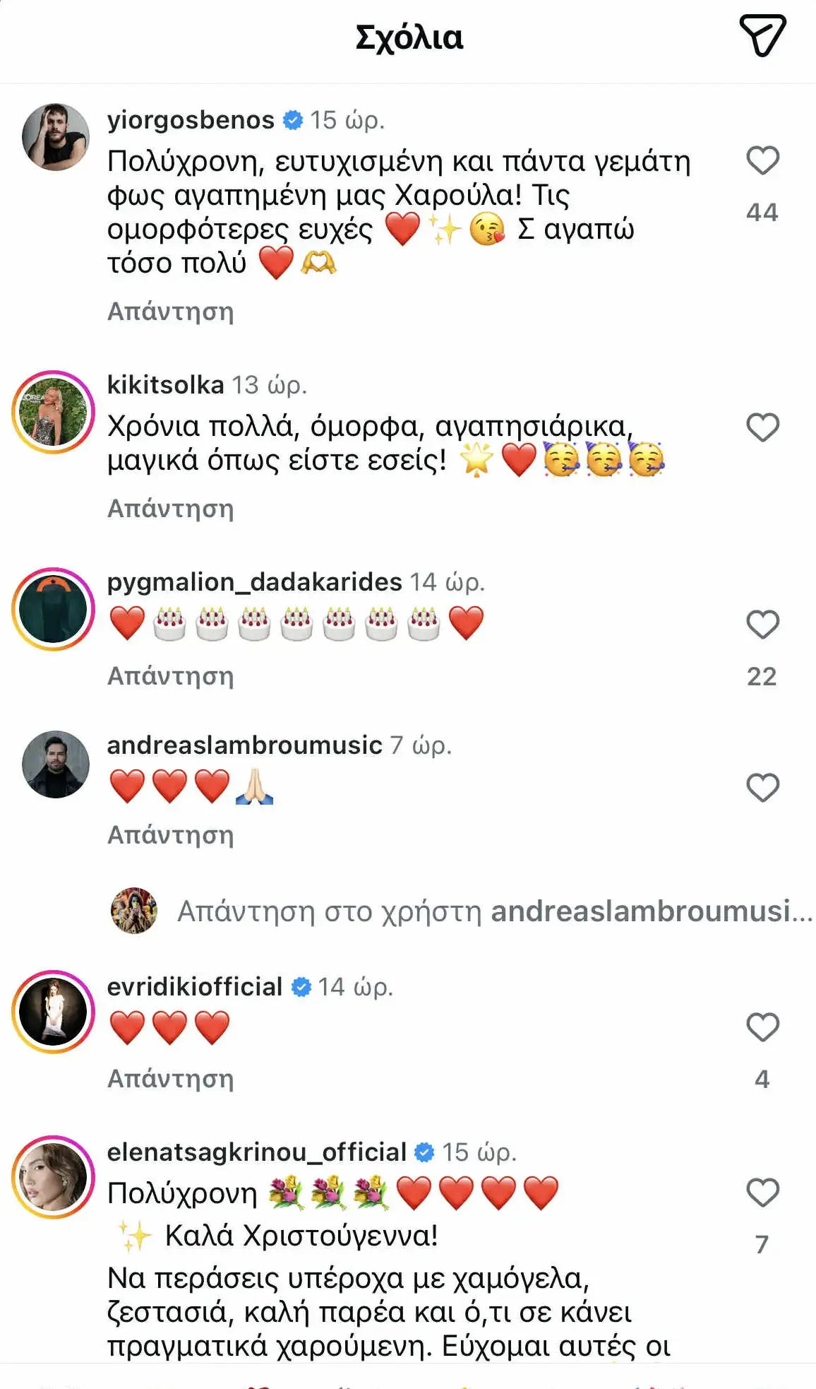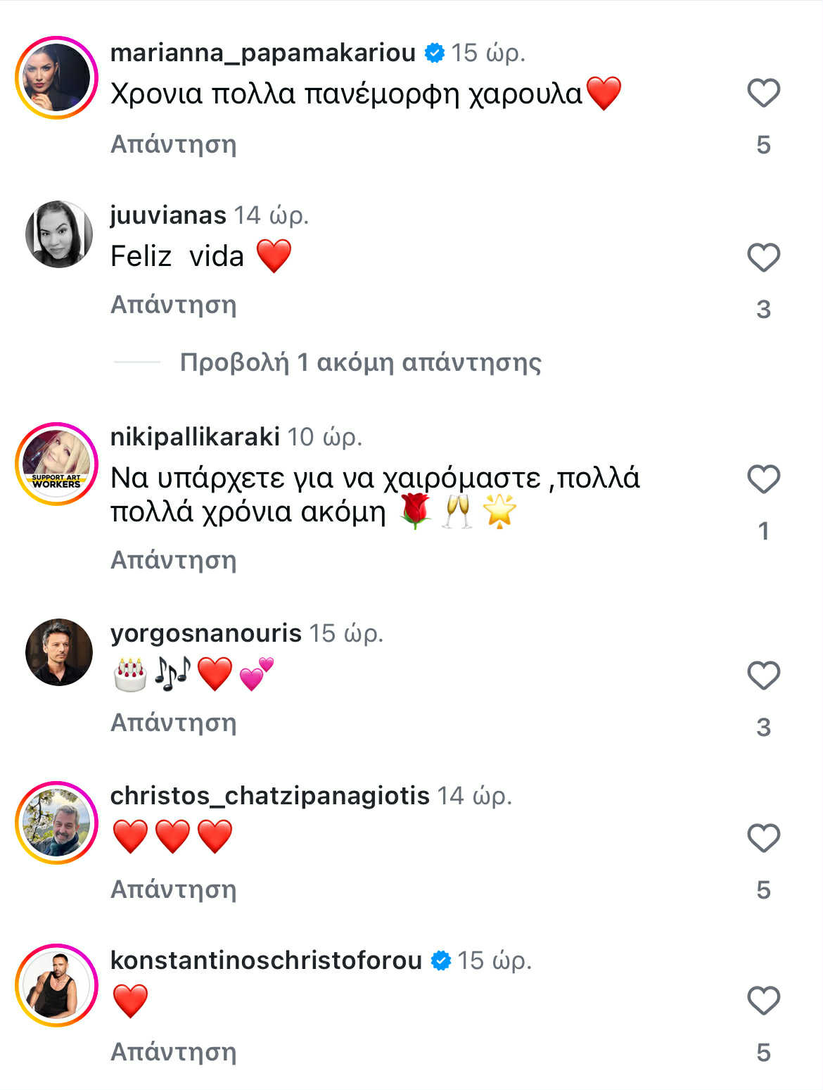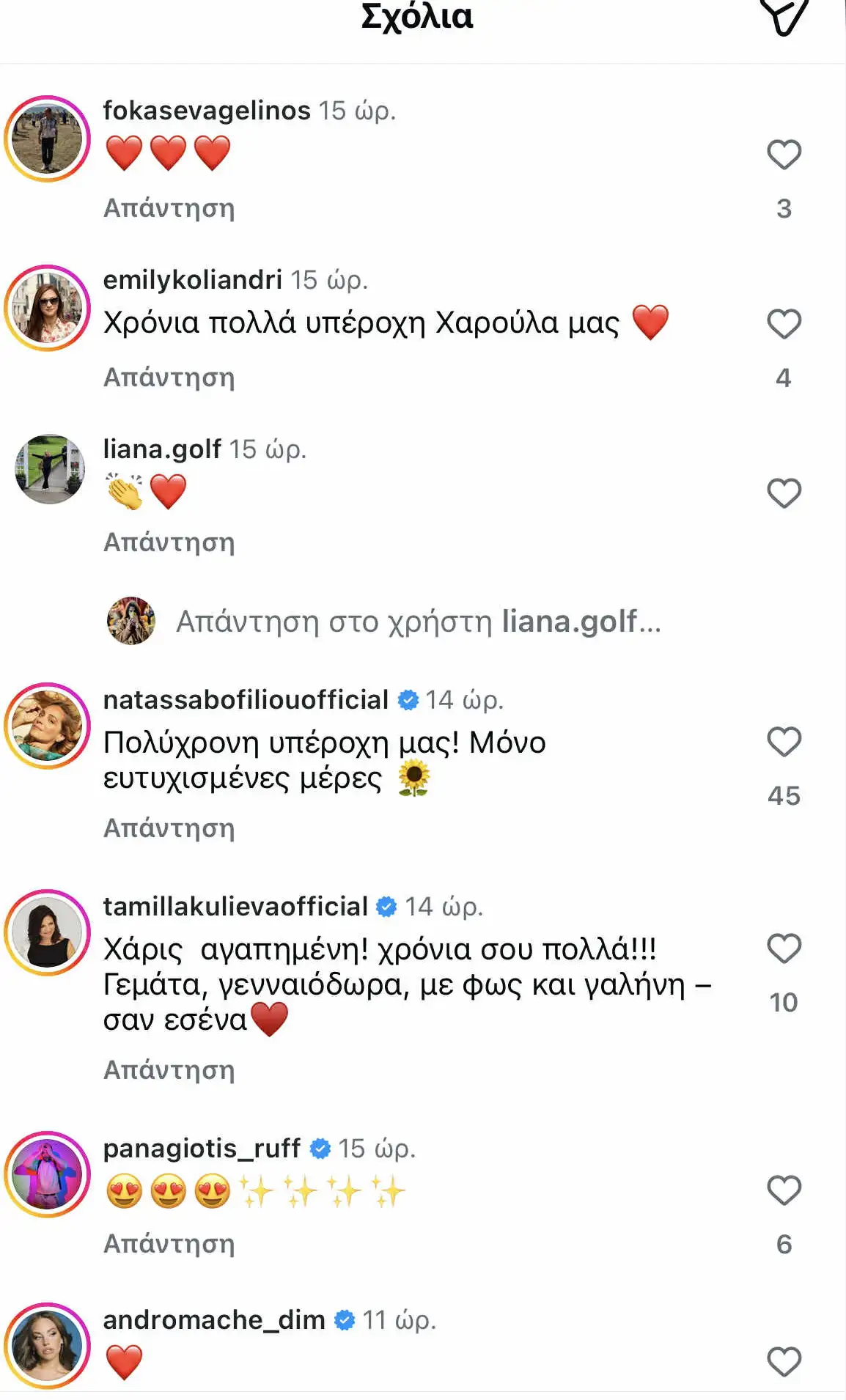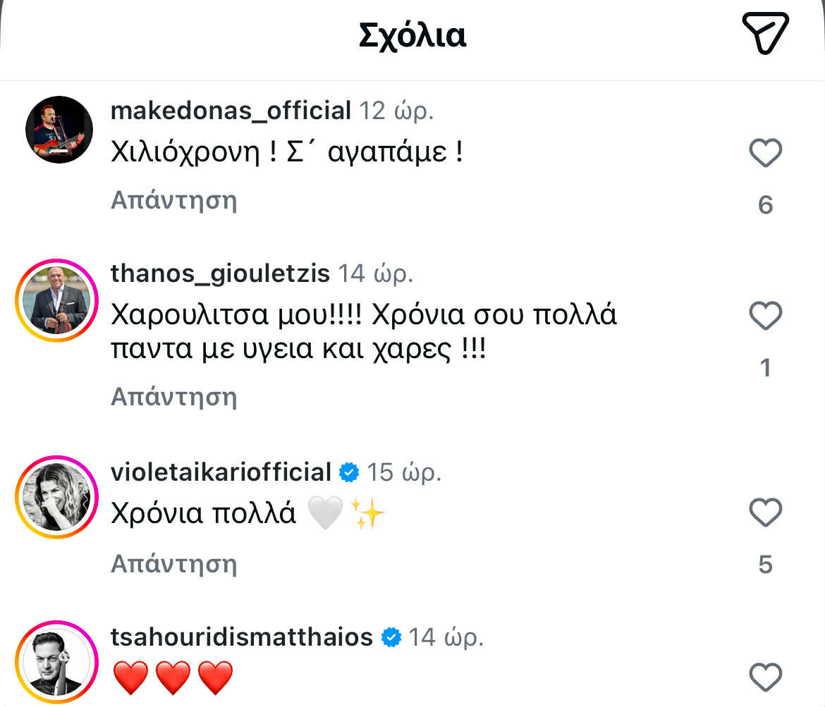 Η ανάρτησή της στα social media γέμισε μέσα σε λίγες ώρες με ευχές, μηνύματα αγάπης και λόγια βαθιάς εκτίμησης. Καλλιτέχνες, συνεργάτες, φίλοι αλλά και απλοί άνθρωποι που μεγάλωσαν με τα τραγούδια της, έσπευσαν να της πουν το δικό τους «ευχαριστώ» — όχι μόνο για τη μουσική, αλλά και για τη στάση ζωής της.