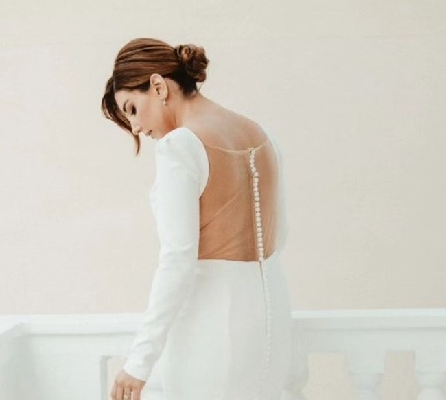Πολύ ιδιαίτερη ήταν η πλάτη του νυφικού της, η οποία έδινε την ψευδαίσθηση ότι ήταν γυμνή, αλλά ήταν ντυμένη με διάφανο ύφασμα που έκλεινε με κουμπιά, τα οποία συνέχιζαν στη φούστα της.