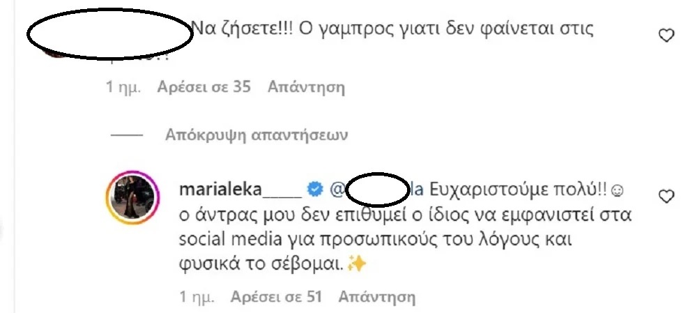 «Τον άντρα τις γιατί δεν τον δείχνει; Ντρέπεται που έχουν κοντά 30 χρόνια διαφορά!», ήταν το σχόλιο που δέχτηκε, ενώ η Μαρία Λέκκα απάντησε: «Κατερίνα μου με τον καλό σου λόγο… ο άντρας μου χωρίς να θέλω να στο χαλάσω είναι 13 χρόνια μεγαλύτερος μιας και σε ενδιαφέρει τόσο πολύ να μάθεις την ηλικία του. Έλα τώρα όμως ΜΗ ΖΗΛΕΥΕΙΣ».