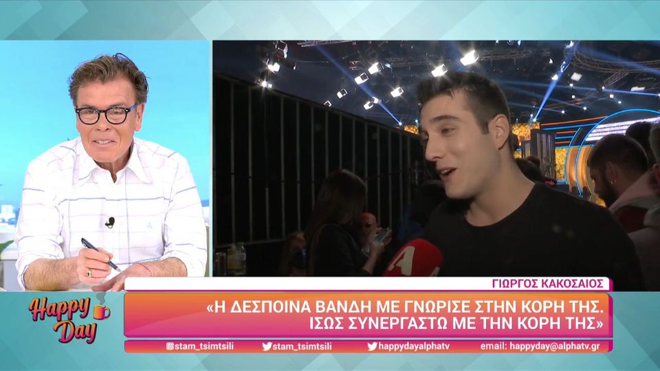«Μου αρέσει πάρα πολύ η Δέσποινα Βανδή. Την ακούω από μικρό παιδάκι. Την γνώρισα σήμερα, δεν την ήξερα… Τι μου είπε; Με γνώρισε στην κόρη της…Μπορεί στο μέλλον να έχουμε μια συνεργασία οι δυο μας, μαζί με την κόρη της» αποκάλυψε ο Γιώργος Κακοσαίος.
