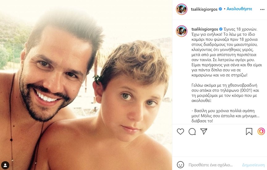 «Έγινες 18 χρονών. Έχω γιο ενήλικα! Το λέω με το ίδιο καμάρι που φώναζα πριν 18 χρόνια στους διαδρόμους του μαιευτηρίου, κλαίγοντας ότι γεννήθηκες γερός, μετά από μια απίστευτη περιπέτεια σαν ταινία. Σε λατρεύω αγόρι μου. Είμαι περήφανος για σένα και θα είμαι για πάντα δίπλα σου να σε καμαρώνω και να σε στηρίζω!