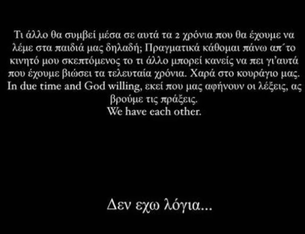Συγκεκριμένα σχολίασε: «Τι άλλο θα συμβεί μέσα σε αυτά τα δυο χρόνια που θα έχουμε να λέμε στα παιδιά μας δηλαδή; Πραγματικά κάθομαι πάνω από το κινητό μου σκεπτόμενος το τι άλλο μπορεί κανείς να πει γι΄αυτά που έχουμε βιώσει τα τελευταία χρόνια. Χαρά στο κουράγιο μας. In due time and God willing, εκεί που μας αφήνουν οι λέξεις, ας βρούμε τις πράξεις. We have each other. Δεν έχω λόγια. Κουράγιο».