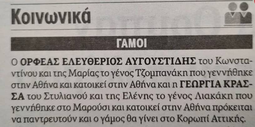 Ειδικότερα, η αγγελία αναφέρει: «Ο Ορφέας Ελευθέριος Αυγουστίδης του Κωνσταντίνου και της Μαρίας το γένος Τζομπανάκη που γεννήθηκε στην Αθήνα και κατοικεί στην Αθήνα και η Γεωργία Κρασσά του Στυλιανού και της Ελένης το γένος Λιακάκη που γεννήθηκε στο Μαρούσι και κατοικεί στην Αθήνα πρόκειται να παντρευτούν και ο γάμος θα γίνει στο Κορωπί της Αττικής».