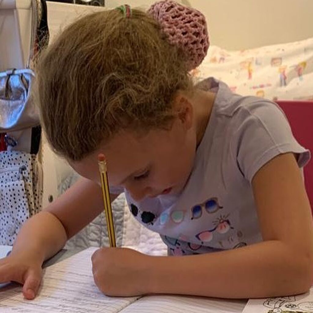 Η Εύα πηγαίνει στην δευτέρα δημοτικού, το σχολείο άρχισε, το ίδιο και οι εργασίες. Έχοντας πιασμένα τα μαλλιά της κότσο. Προφανώς έχει επιστρέψει από τα μάθημα μπαλέτου φαίνεται να κάνει με αφοσίωση τις εργασίες της. Ο μπαμπάς την απαθανατίζει με το κινητό του τηλέφωνο.