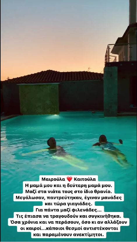 Συγκεκριμένα, η παρουσιάστρια ανέβασε ένα insta story με τη μαμά της και την καλύτερη της φίλη να τραγουδούν απολαμβάνοντας παράλληλα το μπάνιο τους μέσα στην πισίνα.