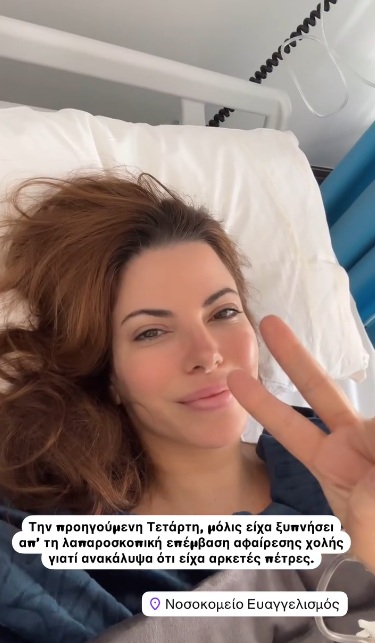 «Την προηγούμενη Τετάρτη μόλις είχα ξυπνήσει από την λαπαροσκοπική επέμβαση αφαίρεσης χολής γιατί ανακάλυψα ότι είχα αρκετές πέτρες», έγραψε η Αντελίνα Βαρθακούρη από το κρεβάτι του νοσοκομείου. Με επόμενη ανάρτηση για τη δεύτερη ημέρα μετά την επέμβαση, η Αντελίνα Βαρθακούρη ευχαρίστησε τον γιατρό της και όλο το προσωπικό του νοσοκομείου «Ευαγγελισμός».