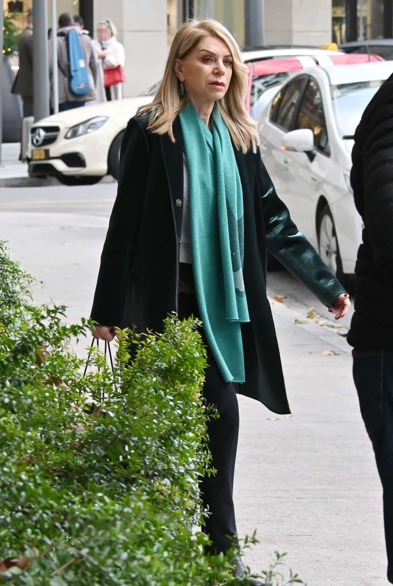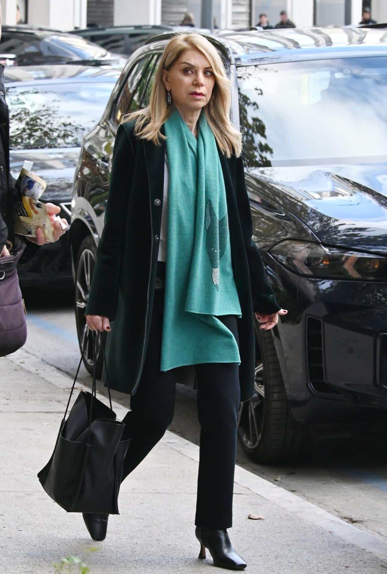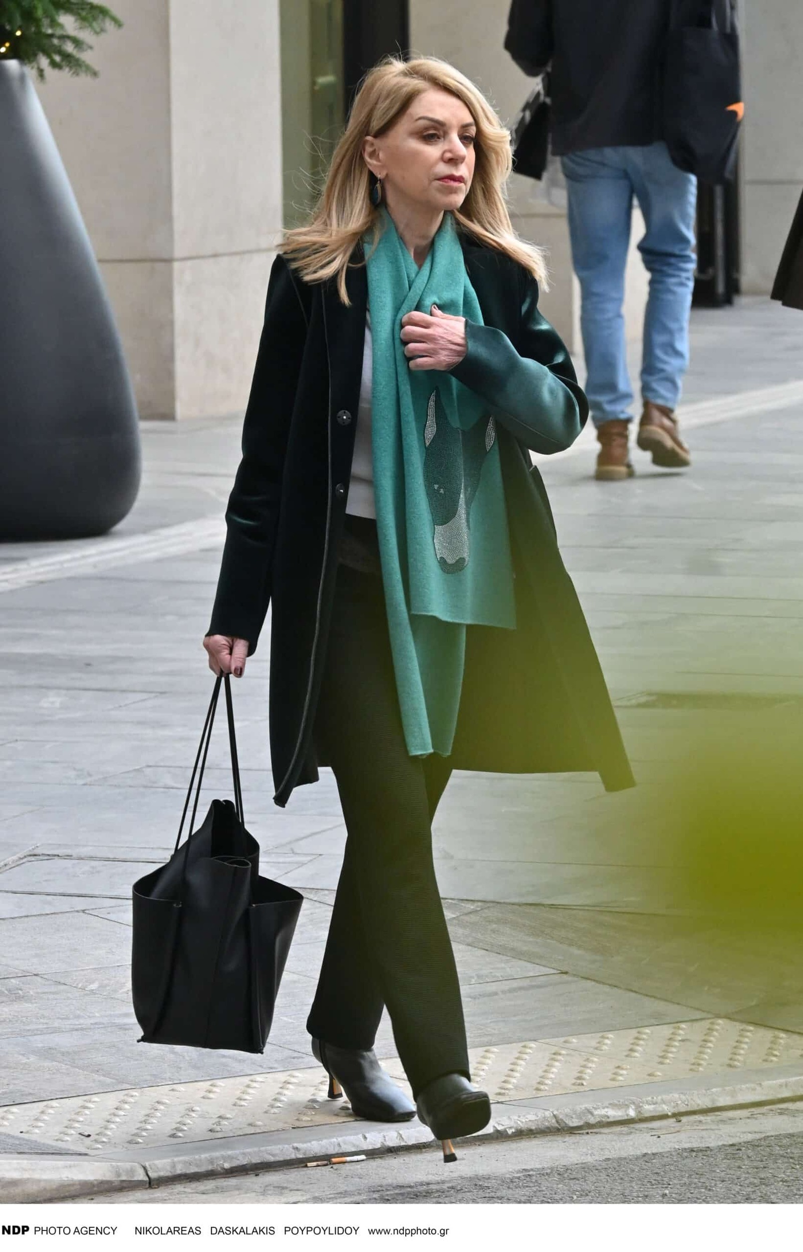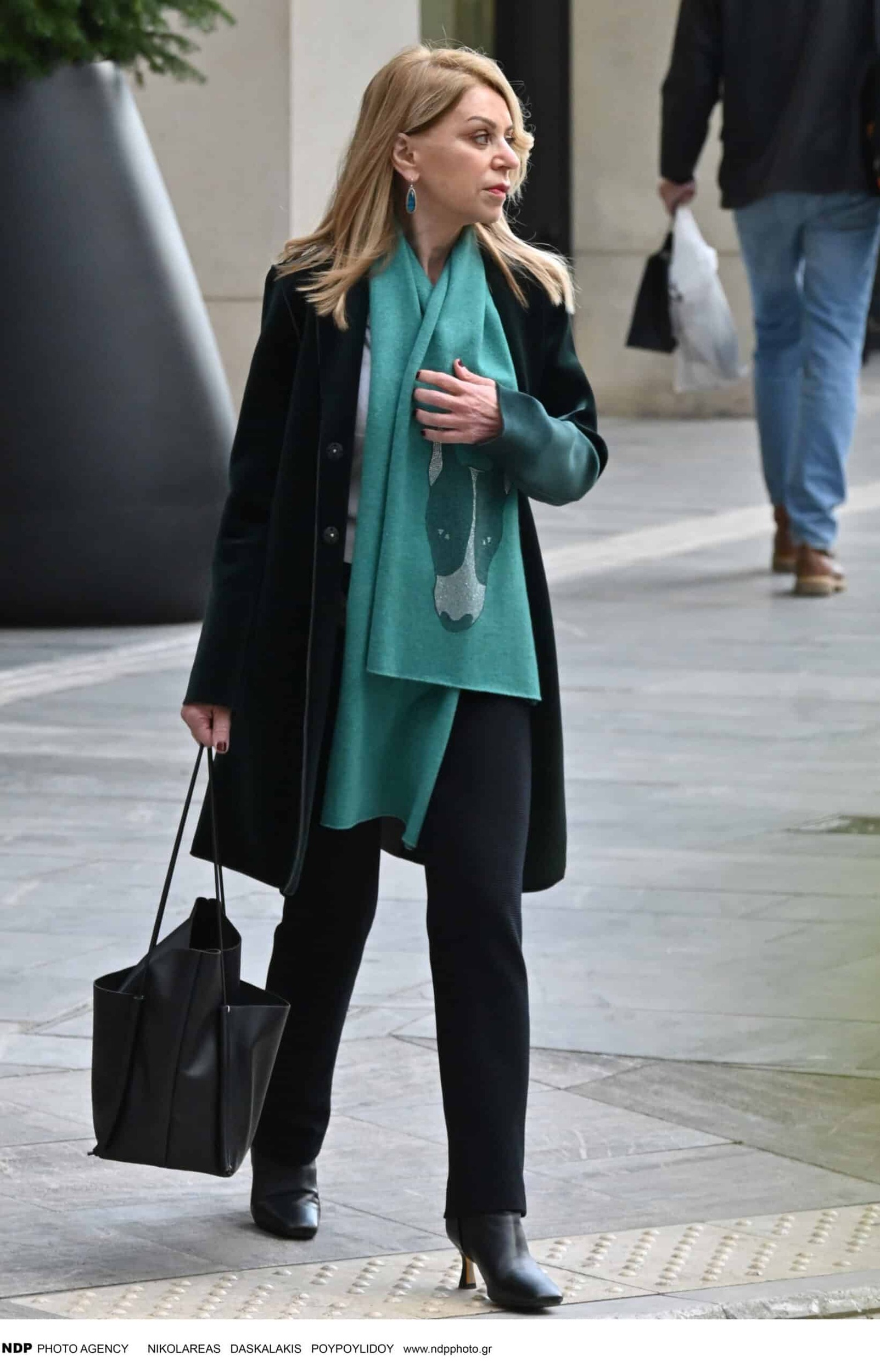 Αυτή τη φορά σε πρωινή της έξοδο στο κέντρο της Αθήνας επέλεξε να φορέσει κλασικό μαύρο παντελόνι σε ίσια γραμμή και λευκή μπλούζα τα οποία συνδύασε με ένα εντυπωσιακό δερμάτινο πανωφόρι, σε σκούρο πράσινο χρώμα, και ένα τιρκουάζ κασκόλ διακοσμημένο με στρας που την προστάτευε από το κρύο δίνοντας φως και ζωντάνια στο σύνολο της.