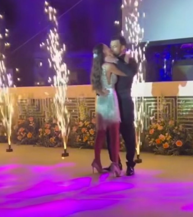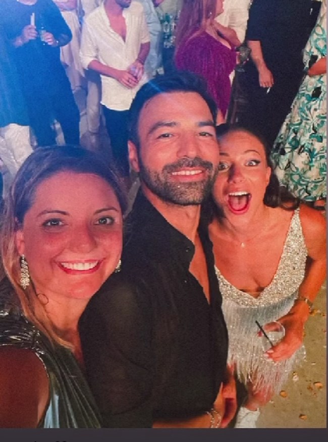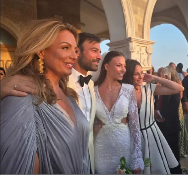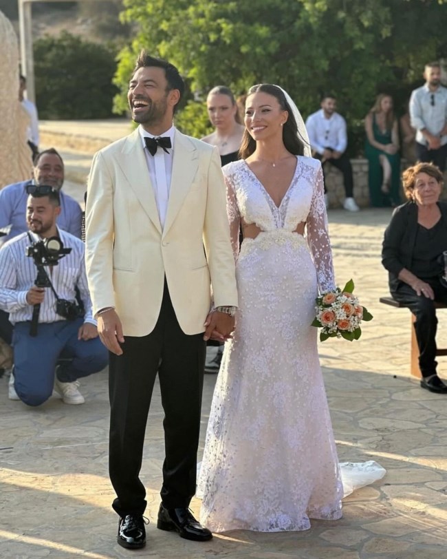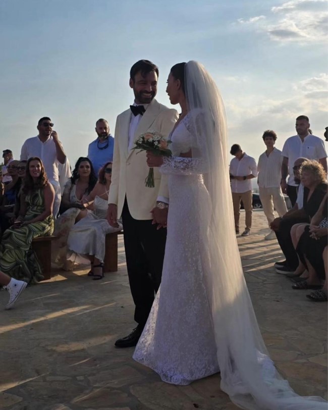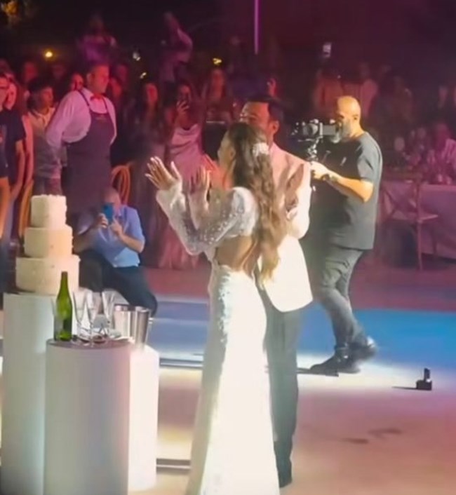 Το ζευγάρι έκοψε τη γαμήλια τούρτα και αφού χόρεψαν τον πρώτο χορό, άλλαξε ρούχα, με τον γαμπρό να φοράει μαύρο πουκάμισο και τη νύφη ένα embellished μίνι φόρεμα με λαμπερά κρόσσια.
