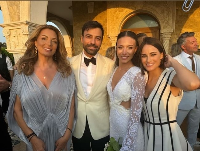 Το ζευγάρι έκοψε τη γαμήλια τούρτα και αφού χόρεψαν τον πρώτο χορό, άλλαξε ρούχα, με τον γαμπρό να φοράει μαύρο πουκάμισο και τη νύφη ένα embellished μίνι φόρεμα με λαμπερά κρόσσια.