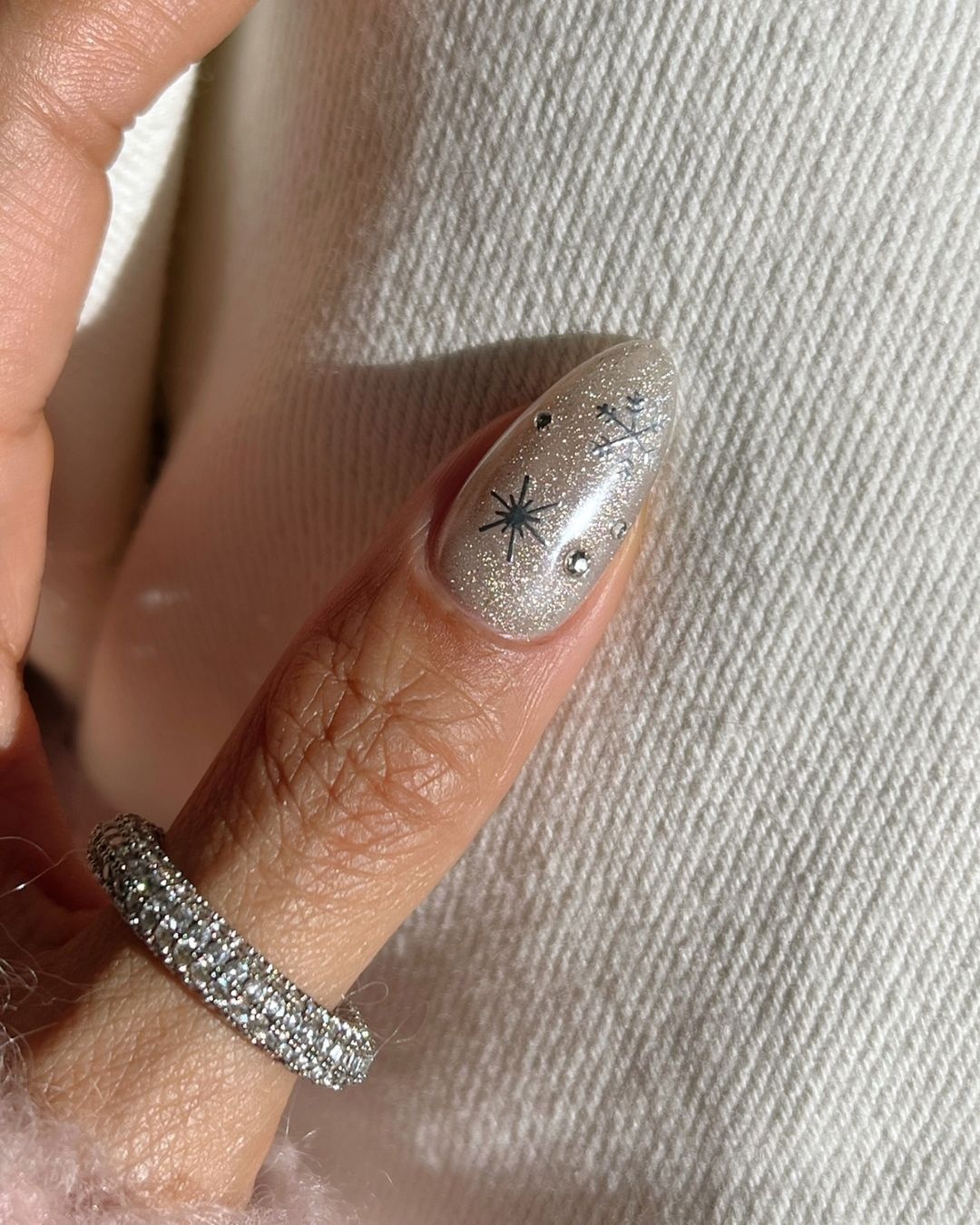 Η Σταματίνα Τσιμτσιλή επέλεξε ένα ασημένιο μανικιούρ με γκλίτερ για να διακοσμήσει την εμφάνισή της κατά τη διάρκεια των φετινών γιορτών. Τα μακριά νύχια σε σχήμα αμυγδάλου έκαναν τα δάχτυλά της να φαίνονται ακόμα πιο λεπτά και κομψά, ενώ το ασημένιο γκλίτερ μανικιούρ είναι μια επιλογή που ταιριάζει με οποιαδήποτε γιορτινή ενδυμασία.