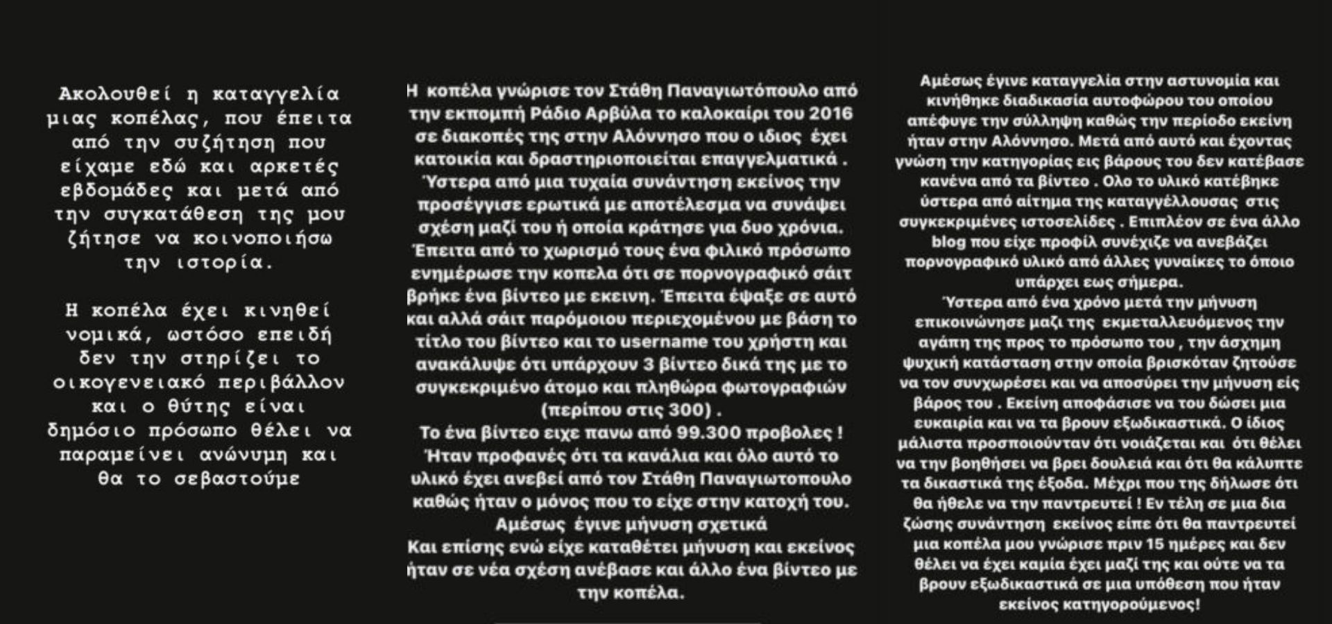 «Με ενημερώνουν κορίτσια ότι σε Αθήνα και Θεσσαλονίκη μέχρι και εχθές οι εν λόγω κύριοι καλούν σε πάρτι κοπέλες. Τα ονόματα που έχω συλλέξει είναι από διάφορους κλάδους. Υπάρχουν κάποιοι που ανήκουν στον αθλητισμό, στην πυγμαχία, υπάρχουν άτομα από ριάλιτι και το μεγάλο κεφάλι είναι επιχειρηματίες που έχουν χρήματα και άκρες να το στηρίξουν αυτό. Οι κοπέλες που μου έδωσαν τα στοιχεία, λαμβάνουν και αυτές μηνύματα» δήλωσε μεταξύ άλλων στην εκπομπή «Πρωινό».