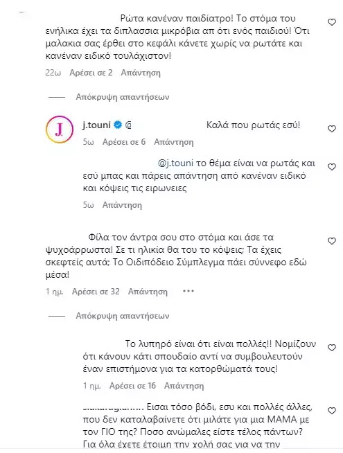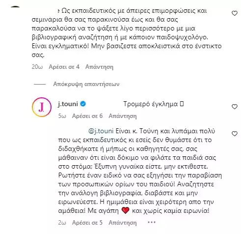 Πολλές ήταν εκείνες που έσπευσαν να “μαλώσουν” την Ιωάννα Τούνη γι’ αυτό καθώς – όπως λένε – πρόκειται για πράξη παραβίασης των προσωπικών ορίων του παιδιού, αλλά και ότι μπορεί να του μεταδώσει πολλά μικρόβια μέσω αυτών των φιλιών. Φυσικά, η Ιωάννα Τούνη δεν άφησε αναπάντητα τα σχόλια αυτά.