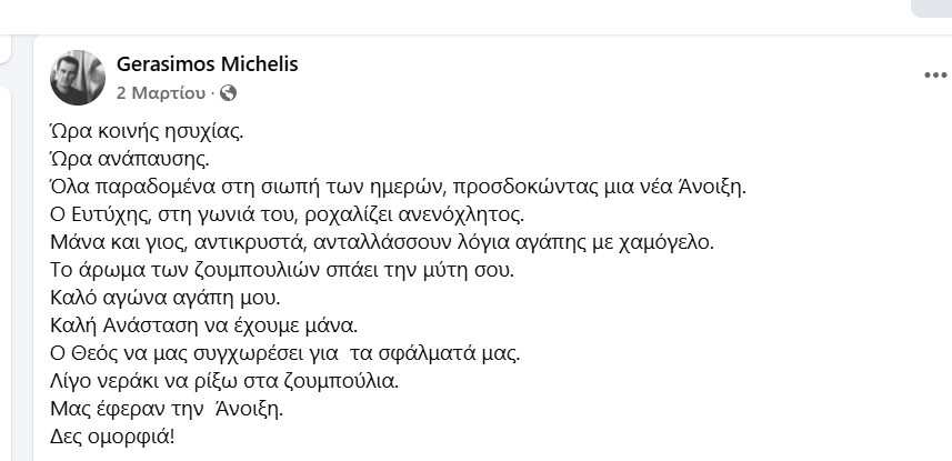 Η τελευταία ανάρτησή του στον προσωπικό του λογαριασμό έγινε τον Μάρτη που δημοσίευσε μία φωτογραφία δική του και μία της μητέρας του και έγραψε: