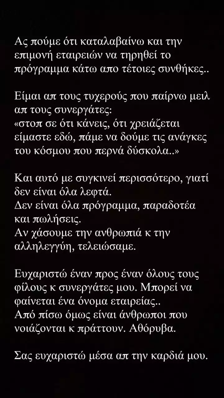 Και αυτό με συγκινεί περισσότερο, γιατί δεν είναι όλα λεφτά. Δεν είναι όλα πρόγραμμα, παραδοτέα και πωλήσεις. Αν χάσουμε την ανθρωπιά και την αλληλεγγύη, τελειώσαμε. Ευχαριστώ έναν προς έναν όλους τους φίλους και συνεργάτες μου. Μπορεί να φαίνεται ένα όνομα εταιρείας, από πίσω όμως είναι άνθρωποι που νοιάζονται και πράττουν. Αθόρυβα. Σας ευχαριστώ μέσα από την καρδιά μου».