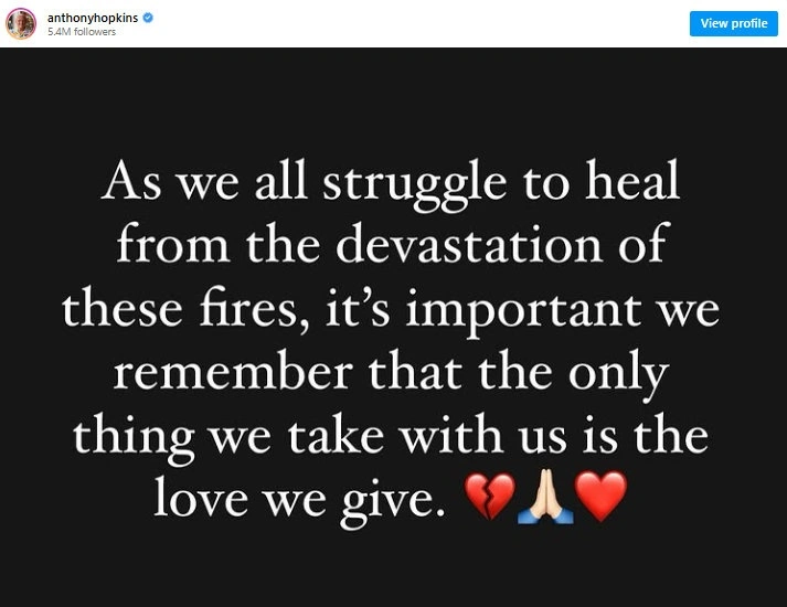 «Καθώς όλοι παλεύουμε να συνέλθουμε από την καταστροφή αυτών των πυρκαγιών, είναι σημαντικό να θυμόμαστε ότι το μόνο πράγμα που παίρνουμε μαζί μας είναι η αγάπη που δίνουμε» αρκέστηκε να γράψει ο Άντονι Χόπκινς, στην πρώτη ανάρτησή του μετά την ολοσχερή καταστροφή του σπιτιού του.