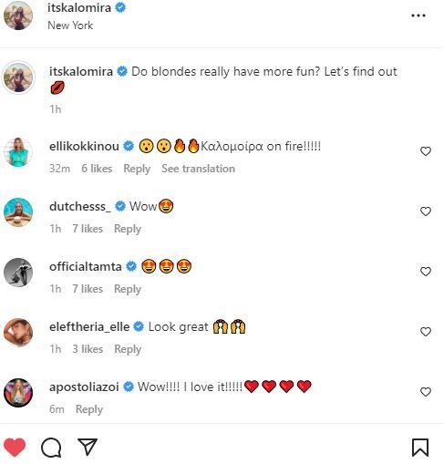 «Μήπως οι ξανθές διασκεδάζουν πιο πολύ; Ας το μάθουμε», έγραψε χαρακτηριστικά η Καλομοίρα ποζάροντας με το νέο της πλατινέ look.