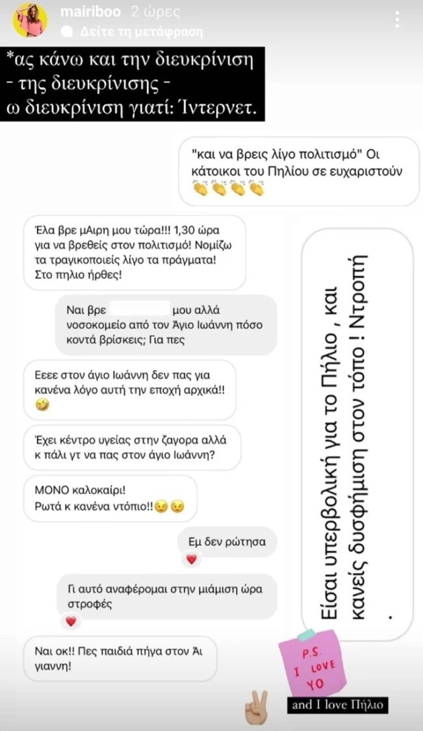Ωστόσο, οι κάτοικοι του Πηλίου θίχτηκαν με αυτή την δήλωση και της έστειλαν μηνύματα κατηγορώντας την ότι κάνει δυσφήμιση της περιοχής κι αυτό είναι ντροπή.
