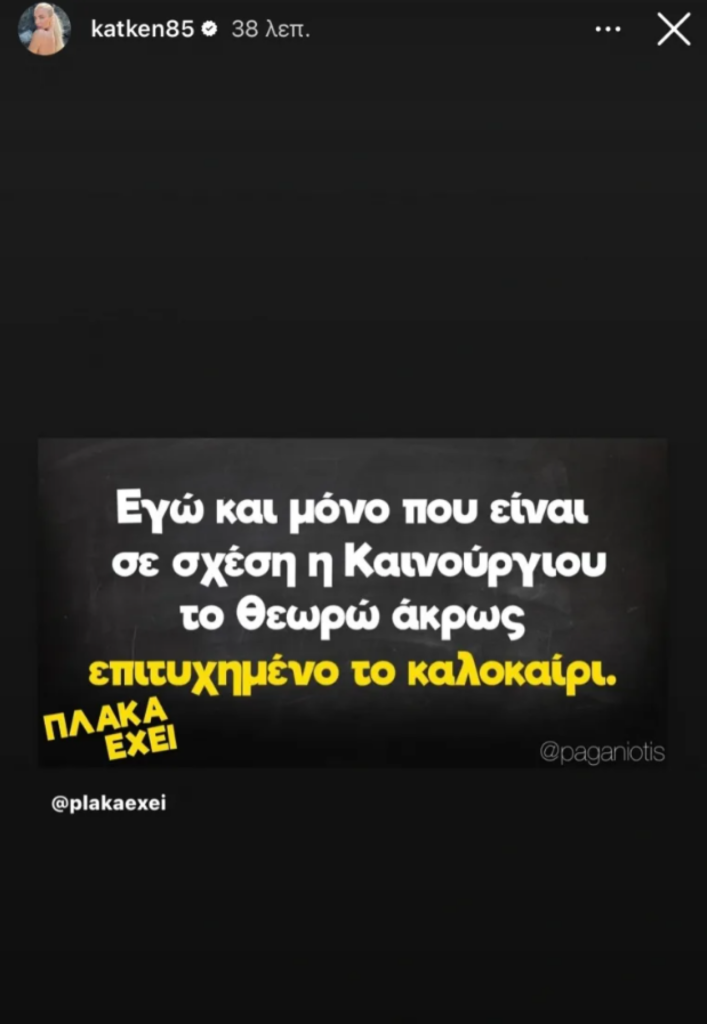 Συγκεκριμένα, η παρουσιάστρια ανάρτησε μια εικόνα που γράφει: «Εγώ και μόνο που είναι σε σχέση η Καινούργιου το θεωρώ άκρως επιτυχημένο το καλοκαίρι».